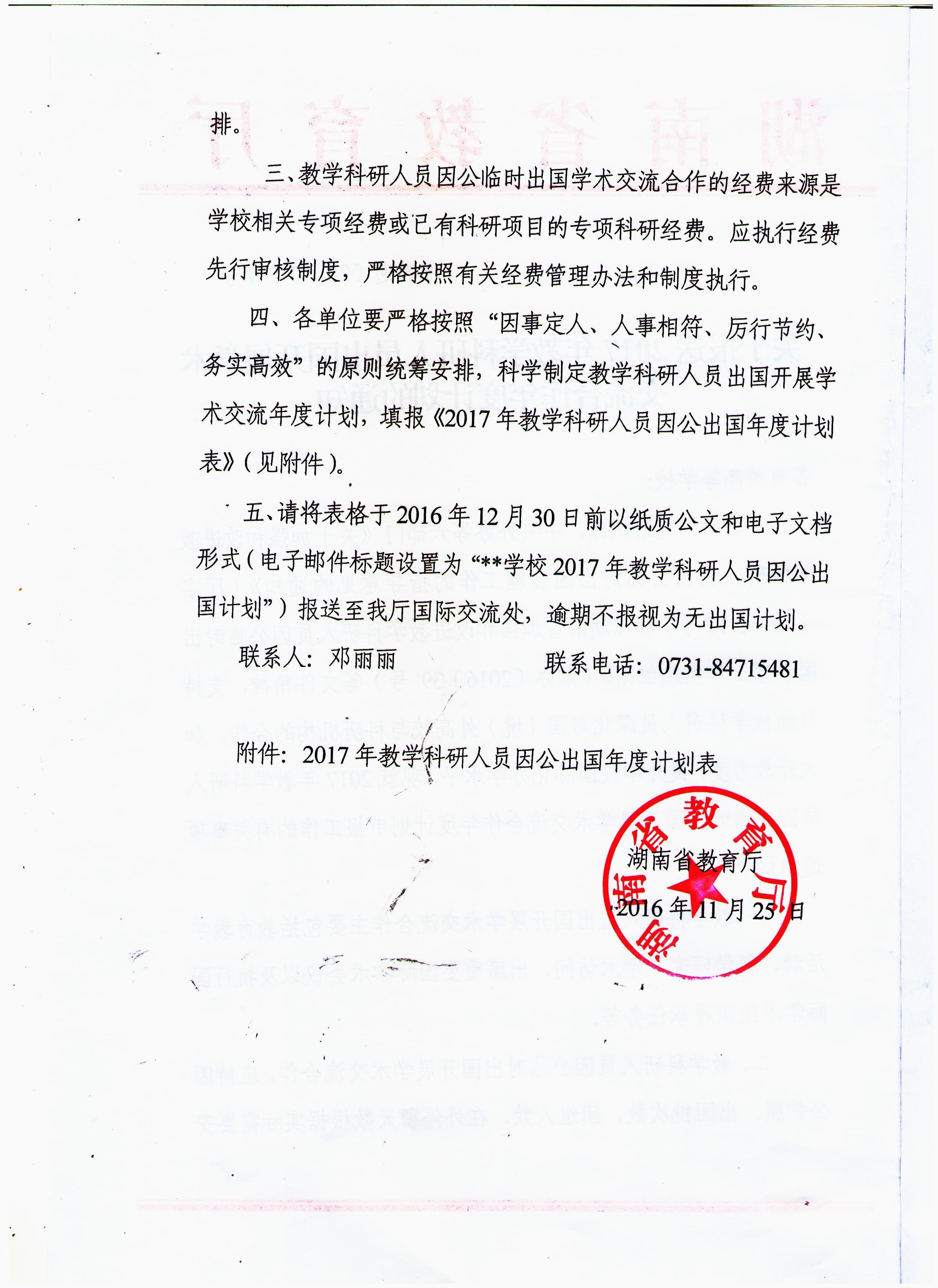 根据省教育厅有关通知要求,现就报送2017年教学科研人员出国开展学术交流合作年度计划事项通知如下: 一、根据上级有关文件规定,伟德官网教学科研人员出国开展学术交流合作,包括教育教学活动、科学研究、学术访问、出席重要国际学术会议以及执行国际学术组织履职任务等,均属因公出国,需办理有关审批手续、持因公护照出访。 二、请各部门各处室严格按照“因事定人、人事相符、厉行节约、务实高效”的原则统筹安排,科学制定教学科研人员出国开展学术交流年度计划,填报《2017年教学科研人员因公出国年度计划表》。并将表格于2016年12月20日前上报国际交流处。上报方式为电子档,包括电子表格和加盖本部门公章的纸质表格。逾期不报视为无出国计划,影响本年度出访责任自负。 三、联系人 国际交流处:刘超,QQ:7758631,faohwu@163.com 附件:2017年教学科研人员因公出国年度计划表.rar