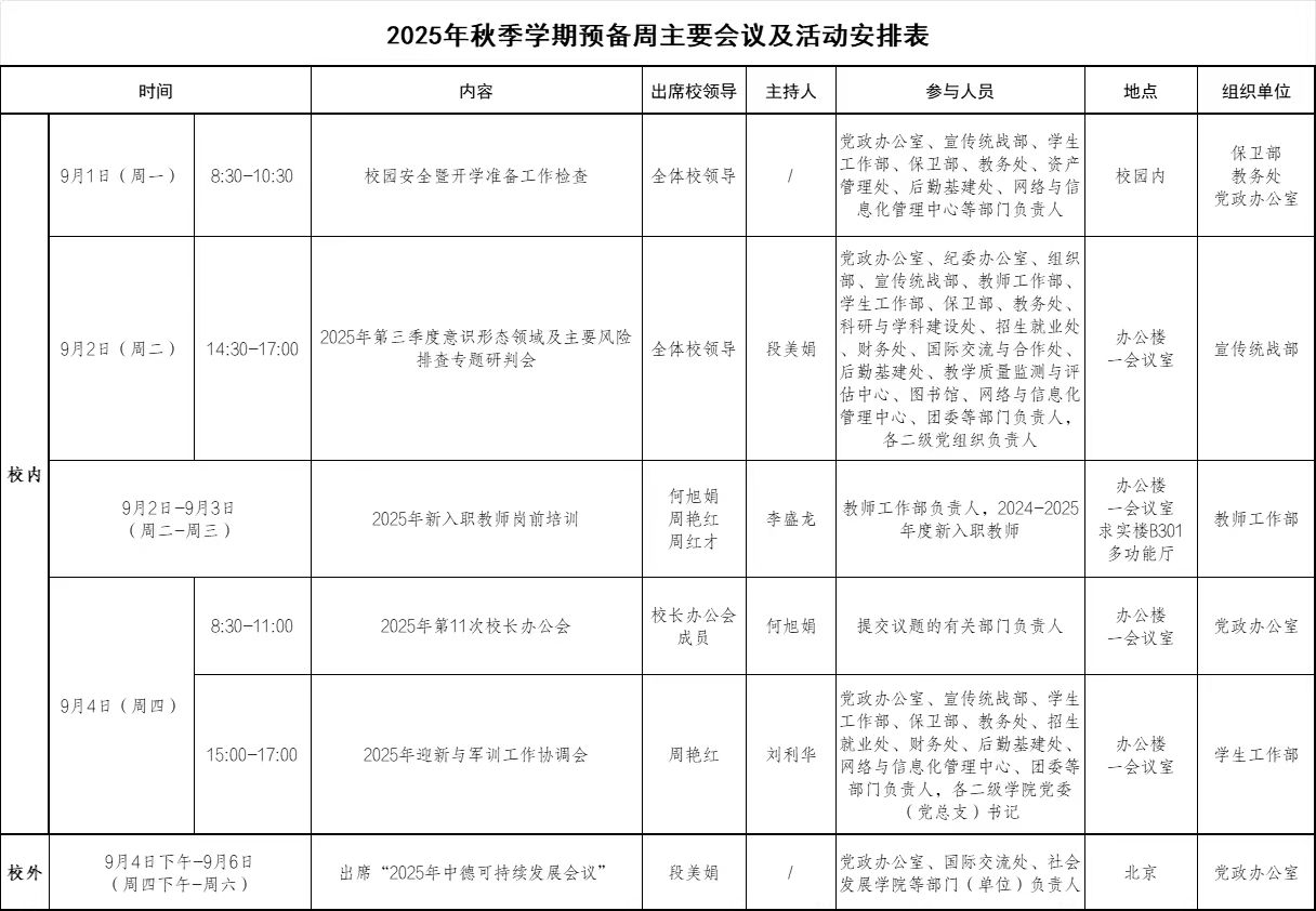2025年秋季学期预备周主要会议及活动安排