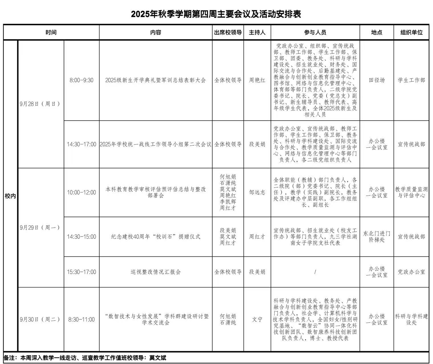 2025年秋季学期第四周主要会议及活动安排