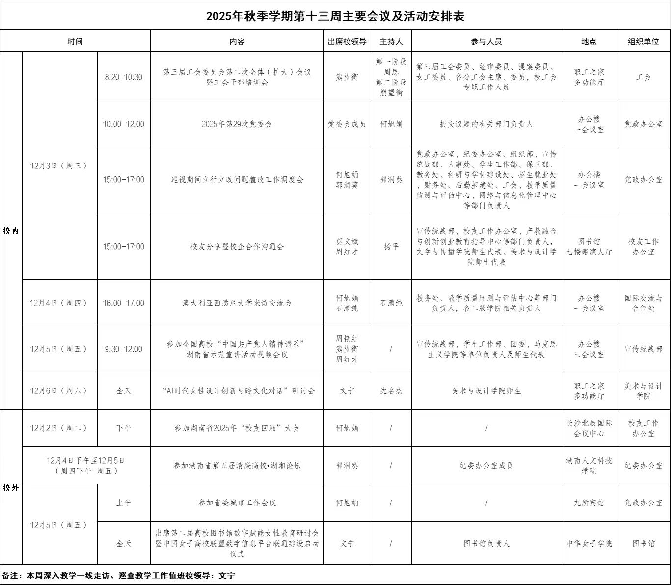 2025年秋季学期第十三周主要会议及活动安排