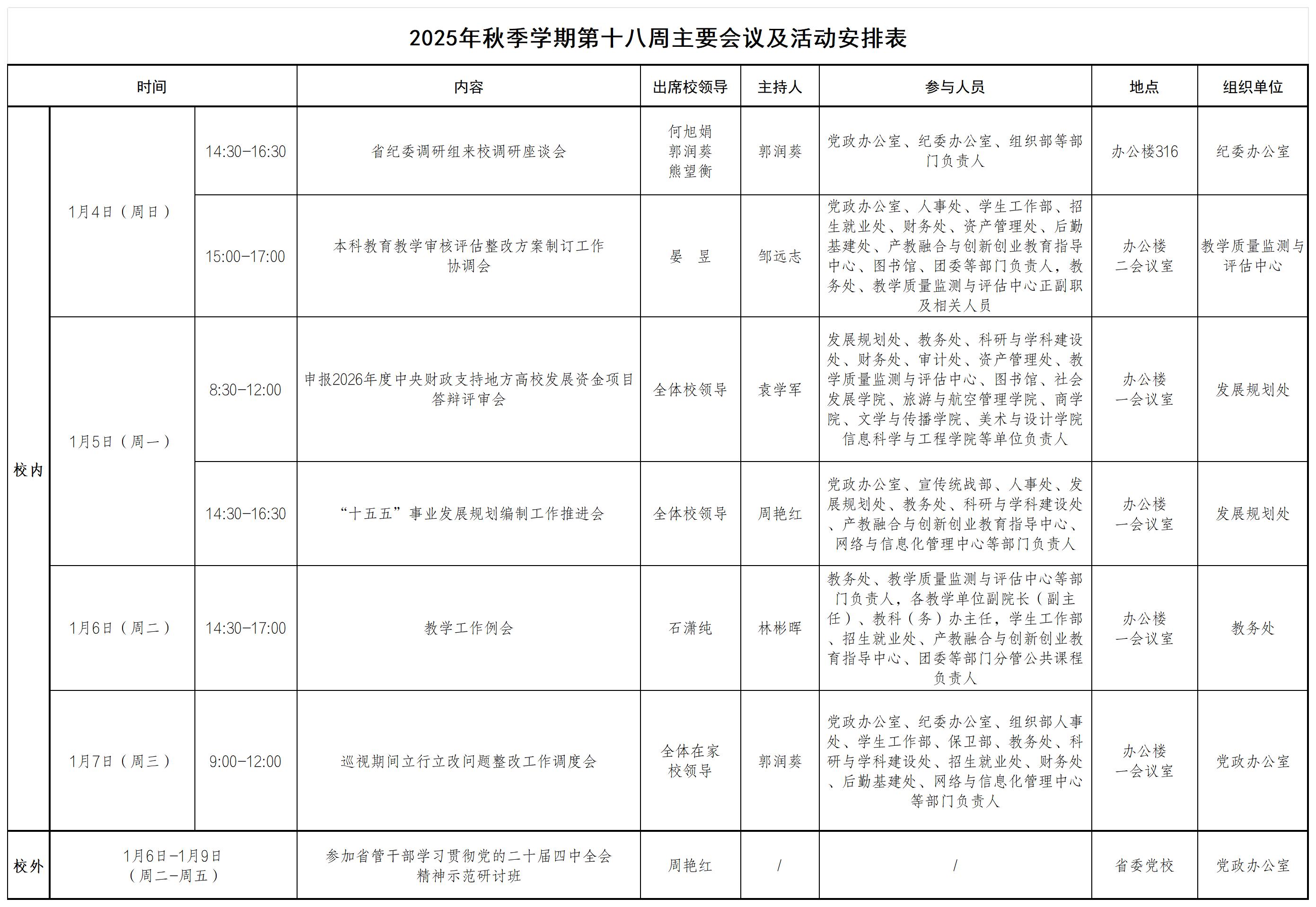 2025年秋季学期第十八周主要会议及活动安排
