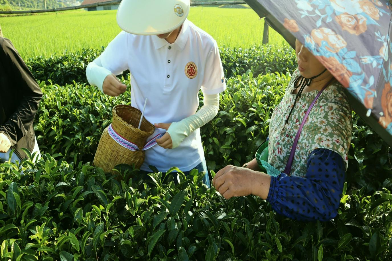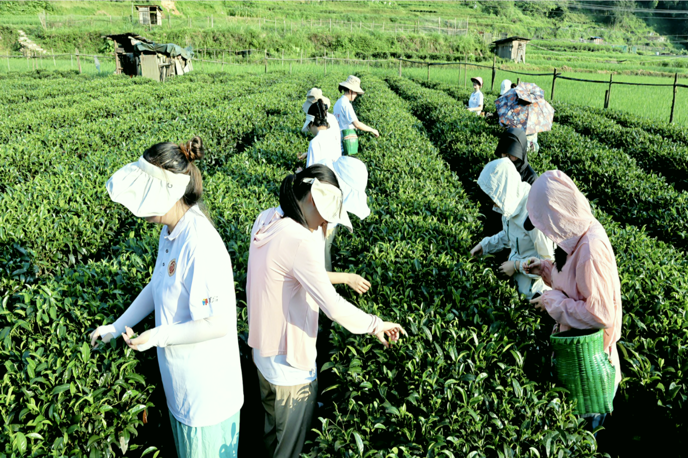 高步村茶园依山而建,茶树郁郁葱葱。队员们身着轻便服装,头戴草帽,腰跨背篓,在茶农的指导下,认真学习采茶技巧。他们穿梭在茶树间,小心翼翼地采摘嫩绿的茶芽,动作从生疏到熟练,脸上洋溢着专注与喜悦。尽管天气炎热,汗水湿透了衣背,但队员们依然干劲十足,深刻体会到茶农的辛勤与不易。