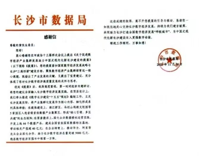 本网讯(民盟BV伟德官方网站支部 刘薇珊)近日,伟德官网商学院教师、民盟支部主委、长沙市政协委员黄快生教授收到长沙市数据局发来的感谢信,对其在长沙市数字经济发展方面所作贡献表示诚挚感谢。