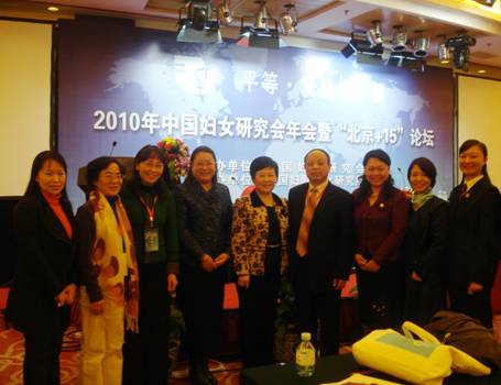 11月29日至30日,中国妇女研究会2010年年会暨“北京+15”论坛在北京举行。院长罗婷教授作为设立在我院的全国妇女/社会性别研究与培训基地负责人出席会议,科研处处长王凤华教授参加会议。会议旨在纪念联合国第四次世界妇女大会召开15周年,总结和回顾15年来我国贯彻落实《北京行动纲领》和《中国妇女发展纲要》的成功经验,分析中国妇女发展所面临的机遇和挑战,深入研讨和推动性别平等和妇女发展问题。 图为湖南参会代表与全国妇联妇女研究所所长谭琳合影