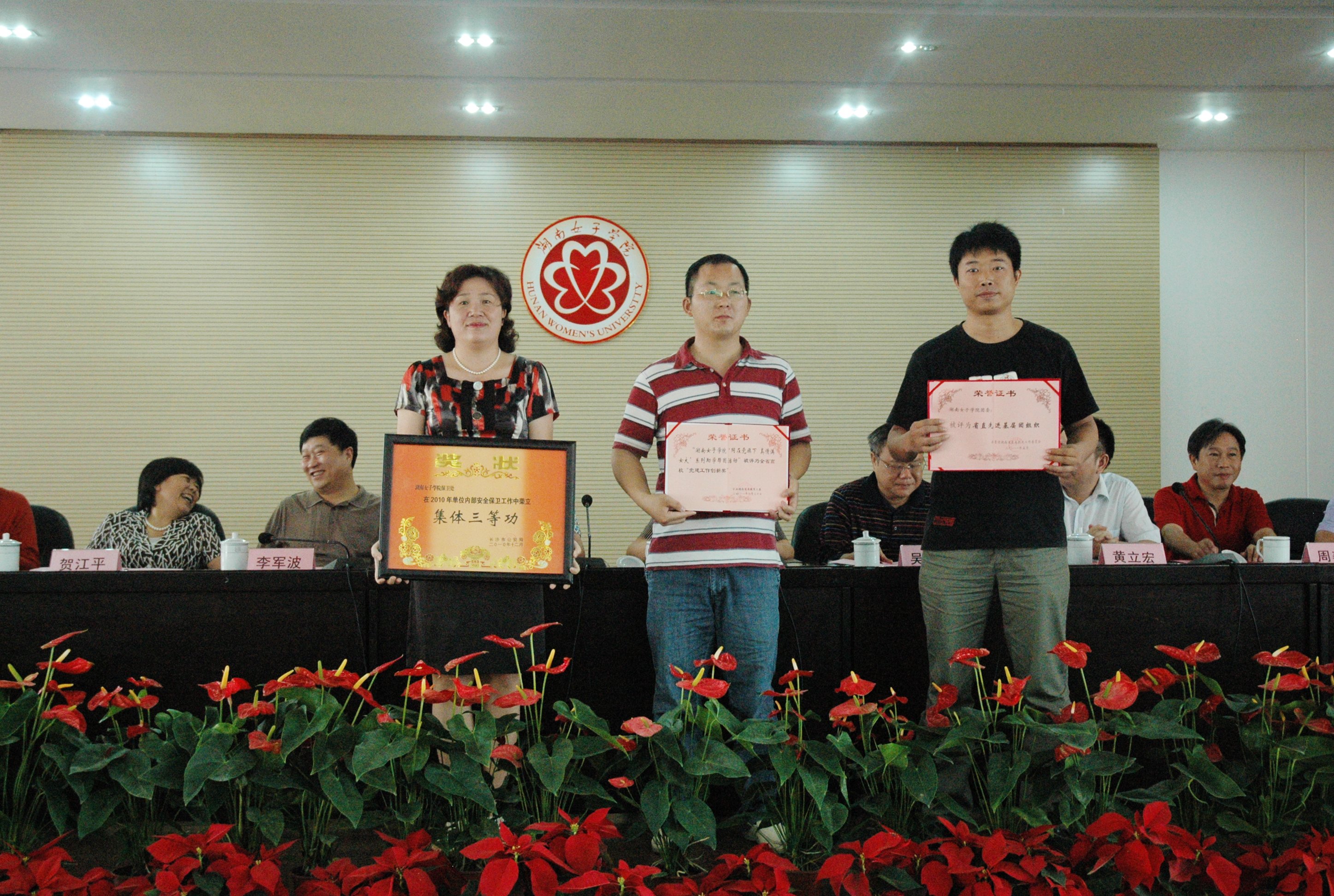 校党委副书记吴洛夫宣读了2010年度考核优秀单位和个人表彰决定,一批行政单位获得省市级以上奖励,2010年度考核中的10个先进单位、68名先进个人受到学校表彰。副校长李军波宣读了2010-2011学年度年度优秀教师、优秀教育工作者、优秀辅导员、优秀教研室表彰决定,12名优秀教师、12名优秀教育工作者、5名优秀辅导员、6个优秀教研室受到学校表彰。副校长黄立宏宣读了2010-2011学年度优秀教学成果奖表彰决定,凌生智老师荣获省教育厅颁发的首届湖南省普通高校教学奉献奖,一批获得省级奖励的单位和省级以上英语演讲比赛、体育比赛、艺术竞赛、多媒体竞赛及学校讲课比赛等获奖单位和个人受到学校表彰。在欢快的乐曲声中,受到表彰的单位代表和个人一一上台领奖,全体校领导为他们颁奖。