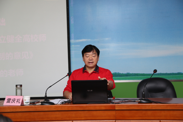雷庆礼强调,高尚的师德师风就是每位教师都要做到爱岗敬业,教书育人,为人师表;大家不能触碰高校师德禁行行为“红七条”高压线。谈到如何才能成为一名学生喜爱的老师时,他和大家分享了自己的经验,那就是真诚无私地热爱学生、乐观全面地评价学生、永远保持年轻的心态。最后,他勉励大家要通过自身的不懈努力,力求达到爱岗敬业精神高尚、教书育人水平高超、为人师表品行高洁的“三高”境界。雷庆礼讲话幽默风趣,寓枯燥的理论于生动的表述之中,给大家留下了深刻的印象,与会教师深受鼓舞和启发。