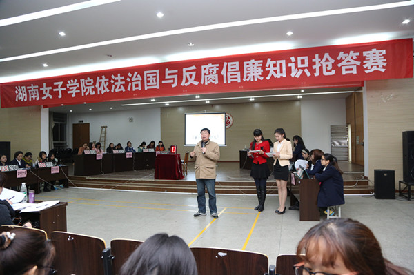 本网讯(学生处 蔡元森 李开蓉)12月9日晚,由学校纪律检查委员会主办,学生工作部和校团委承办的依法治国与反腐倡廉知识竞赛在北院新食堂三楼隆重举行。来自各系的10支代表队参加了比赛。校纪委书记雷庆礼出席,校纪委主任刘娟,学生处副处长朱建军,校团委副书记黄泽军等领导应邀担任评委。