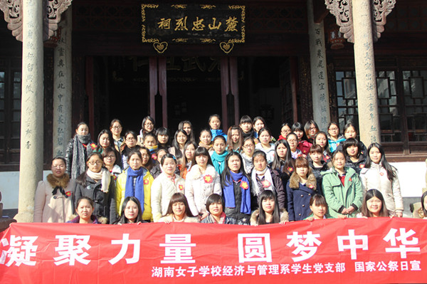 本网讯(经济与管理系 吴泽宇)2014年12月13日是我国第一个南京大屠杀死难者国家公祭日。为了让学生党员铭记历史,牢记使命,上午9:00,经济与管理系学生党支部在岳麓山开展了党员活动。此次党员活动以“以史为鉴,勿忘国耻,凝聚力量,圆梦中华”为主题,在经济与管理系党总支书记林运清的指导下,由学生支部书记吴泽宇老师带领,共有60名学生党员参加了此次活动。