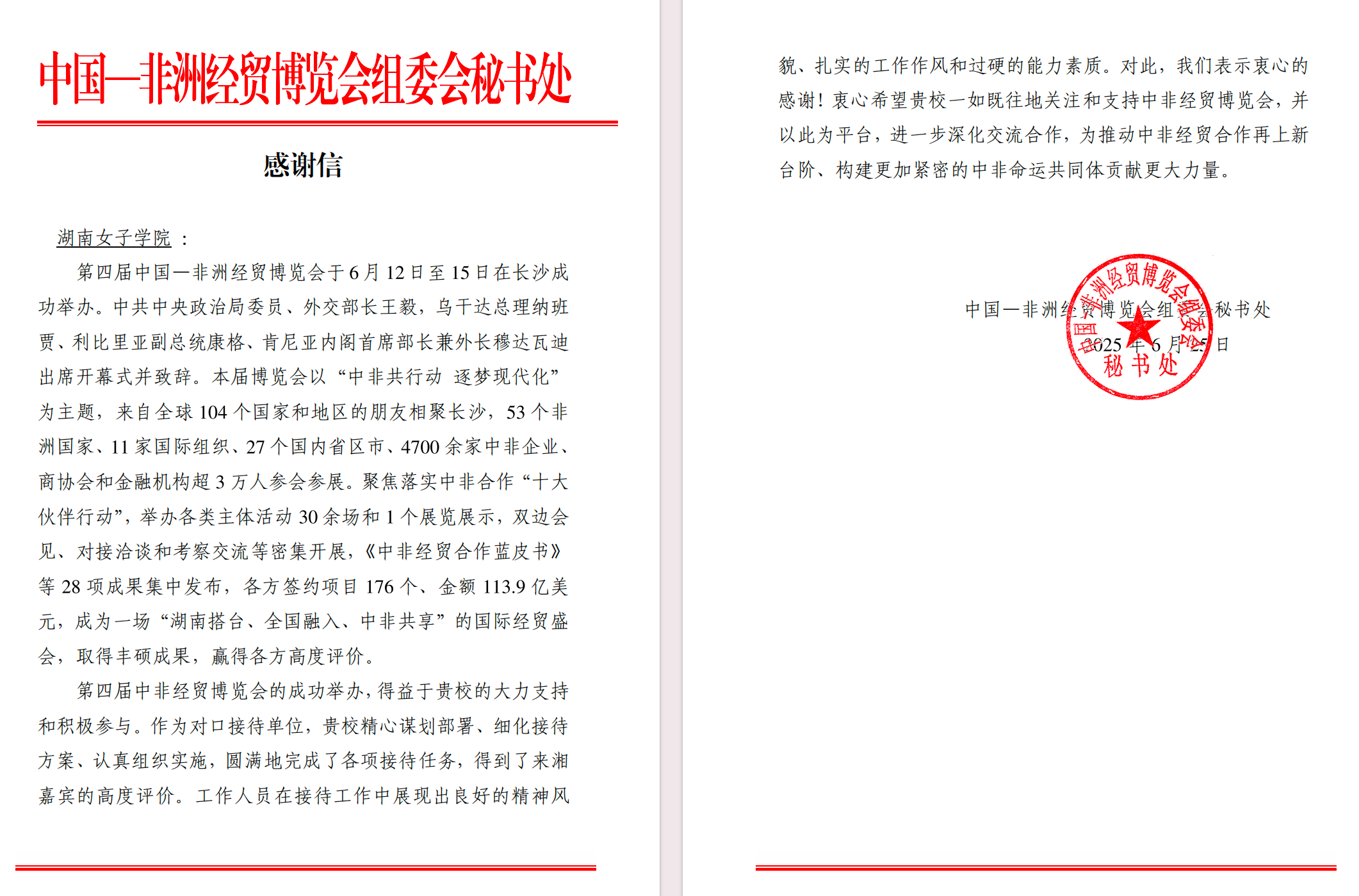 本网讯(国际交流处 龙敏)近日,第四届中国-非洲经贸博览会组委会秘书处向伟德官网发来感谢信,对伟德官网在博览会期间给予的大力支持、积极参与表示感谢。信中指出,伟德官网精心谋划部署、认真组织实施,圆满完成各项接待任务,得到了来湘嘉宾的高度评价。
