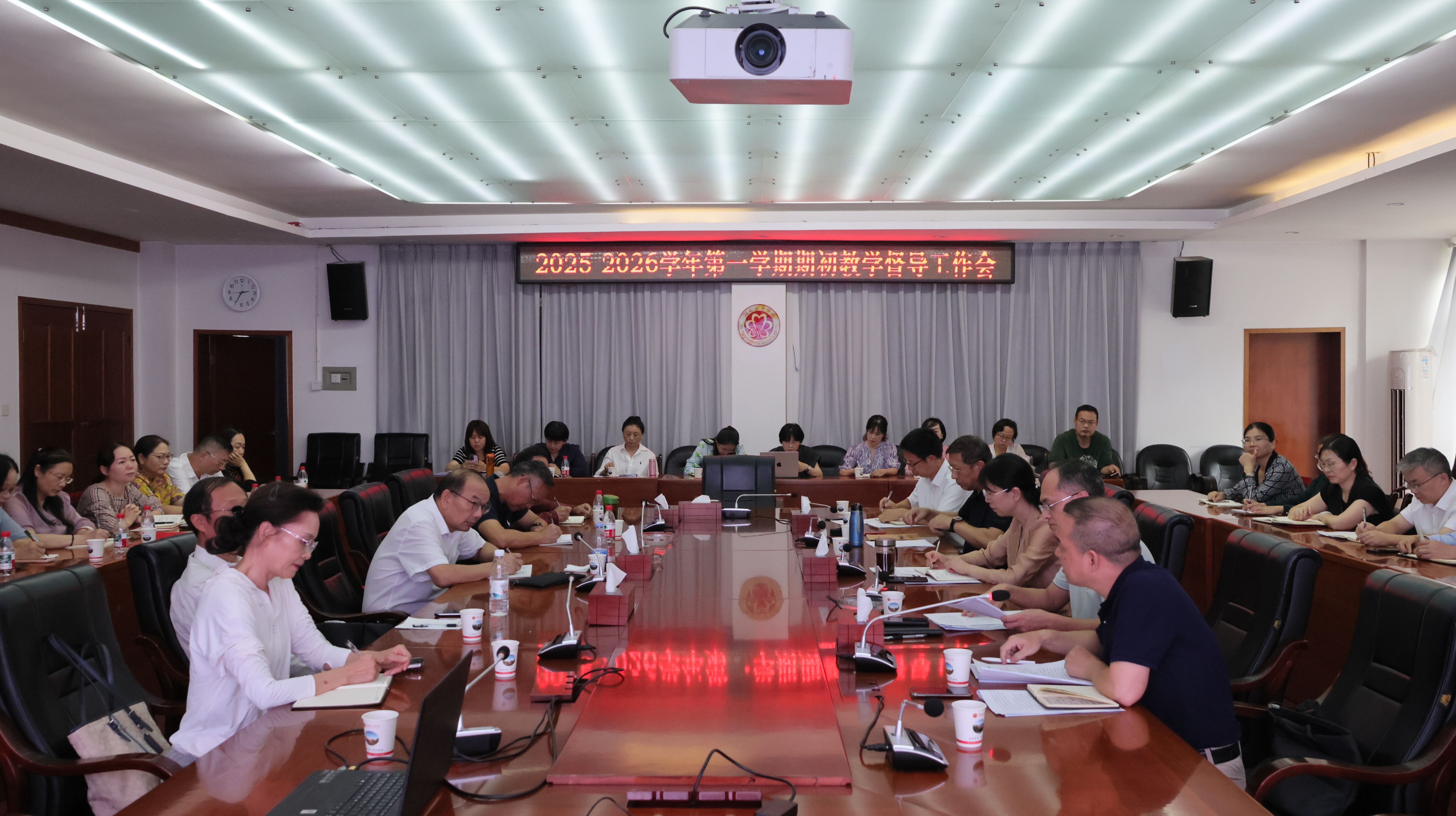 本网讯(教学质量监测与评估中心 匡令芝)2025年9月19日下午,伟德官网2025-2026学年第一学期期初教学督导工作会在办公楼一会议室召开。校长何旭娟出席会议并讲话。教学督导团校院两级教学督导,教务处、人事处、学工部、后勤基建处、网络与信息化管理中心等相关职能部门负责人,各院部教学副院长(副主任)及教学质量监测与评估中心相关人员参加会议。会议由教学质量监测与评估中心主任邹远志主持。