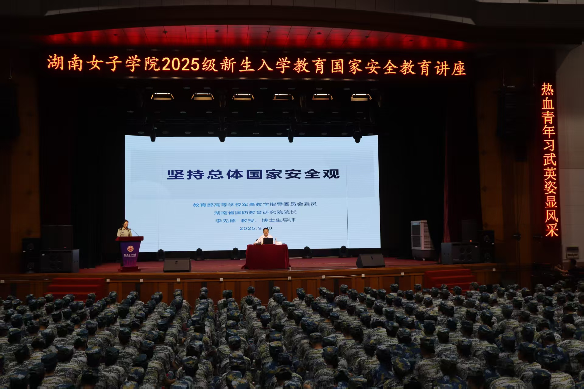 本网讯(学工部 娄青儿 陈翊)为进一步弘扬爱国主义精神,提升学生国防知识水平,伟德官网特邀教育部高等学校军事教学指导委员会委员、湖南省国防教育研究院院长、博士生导师李先德教授,为全体新生作了《坚持总体国家安全观》为主题的国防教育专题讲座。讲座由学生工作部(武装部)副部长张娟主持。2025级新生与全体教官共2700余人参加。