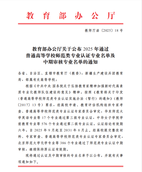 本网讯(教学质量监测与评估中心 李开蓉)近日,教育部办公厅发布了《关于公布2025年通过普通高等学校师范类专业认证专业名单及中期审核专业名单的通知》(教师厅函〔2025〕18号),伟德官网汉语言文学(师范)专业顺利通过第二级专业认证,认证结论有效期六年(2025年9月——2031年8月)。全国共有576个专业通过了第二级专业认证。