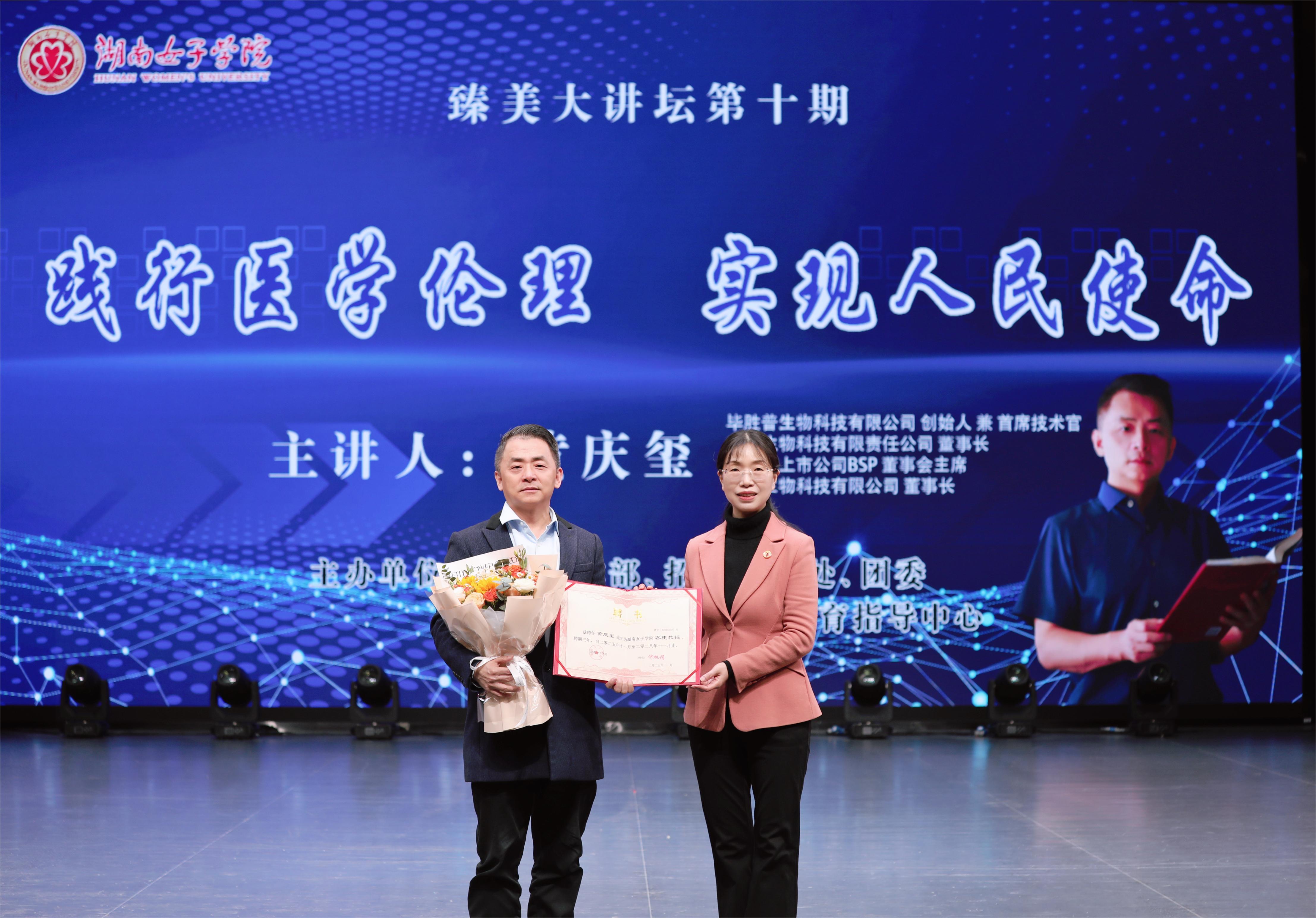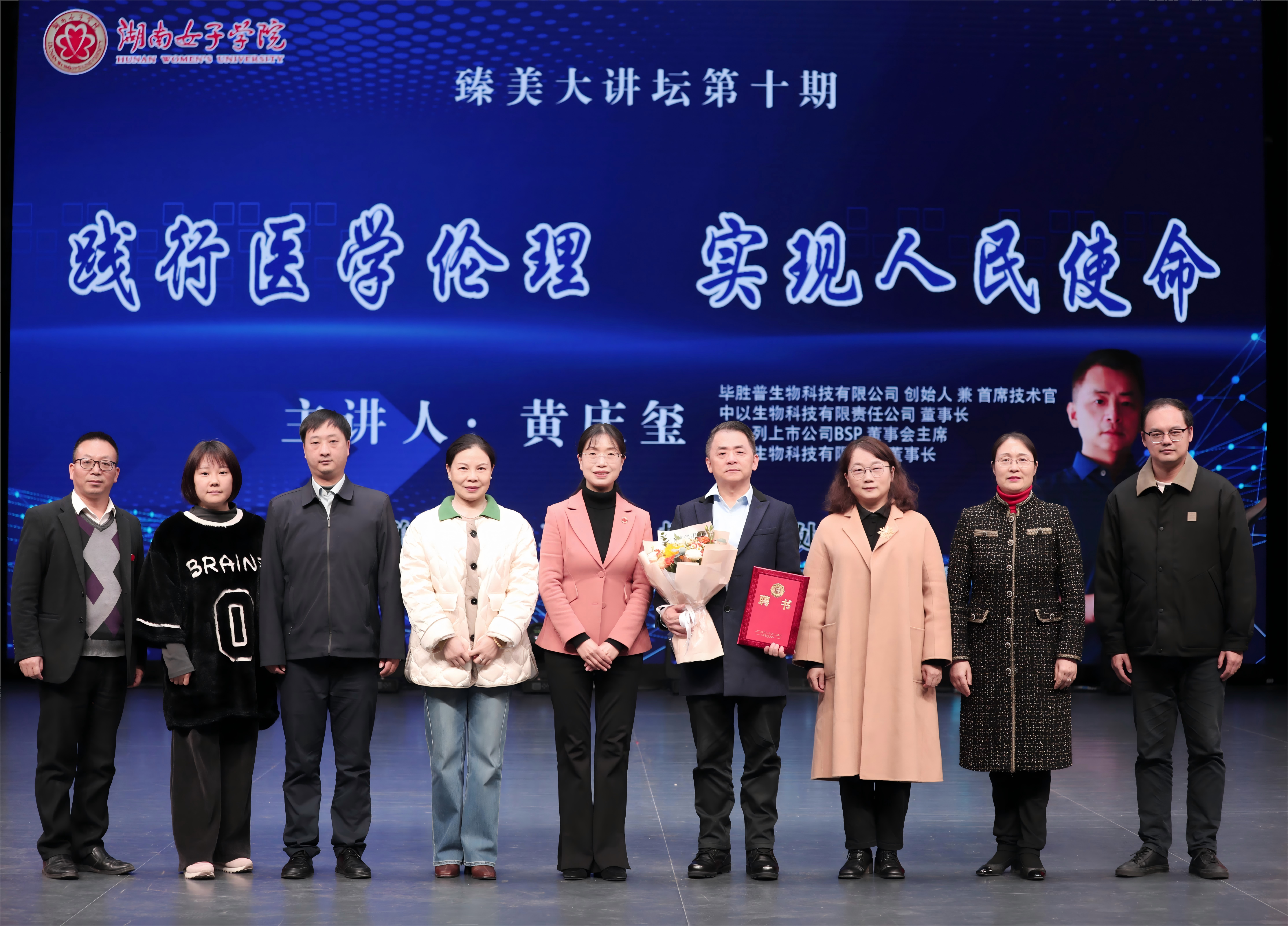 本网讯(学工部 朱晟 刘阳)11月18日下午,伟德官网第十期“臻美大讲坛”在求实楼骄杨剧场举行,中国生物科技领域优秀企业家黄庆玺应邀来校作“践行医学伦理,实现人民使命”主题讲座。党委副书记、校长何旭娟出席并为黄庆玺颁发“客座教授”聘书。学生工作部、招生就业处、产教融合与创新创业教育指导中心、团委等相关职能部门负责人、各二级学院党委(党总支)副书记、全体辅导员及学生代表共800余人现场聆听报告。讲座由党委委员、副校长周艳红主持。