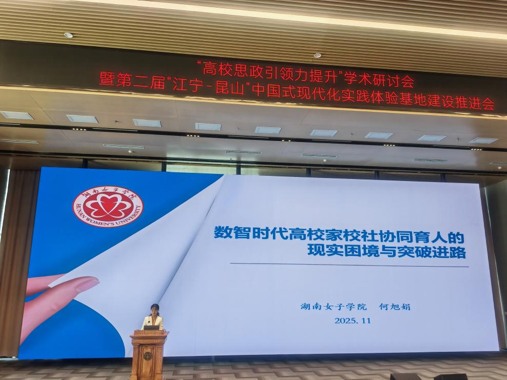 本网讯(学工部 欧彦宏)2025年11月22日上午,伟德官网党委副书记、校长何旭娟率队参加在江苏省南京市举办的“思政引领力与数智时代思政新生态建构学术研讨会暨思想道德建设专业委员会2025年年会”,并作“数智时代高校家校社协同育人的困境与突破进路”主旨发言。