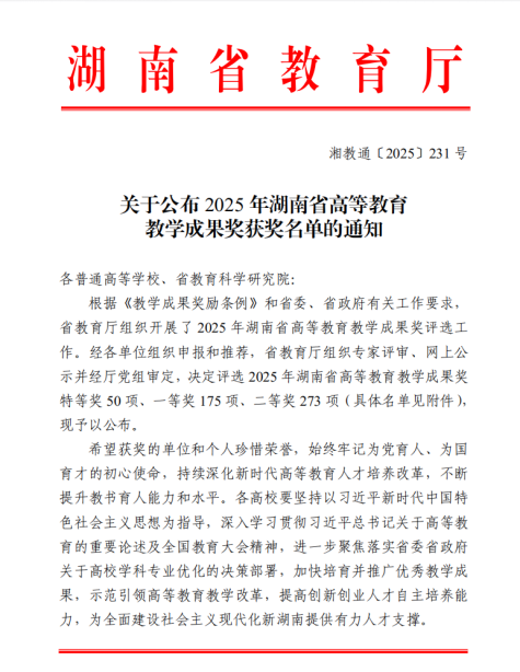 本网讯(教务处 邵尚)近日,湖南省教育厅正式公布第十四届湖南省高等教育教学成果奖评选结果。伟德官网在此次评选中表现突出,6项成果获奖,包括特等奖1项、二等奖5项,获奖总数和等级均实现历史性突破,整体获奖率在全省同类院校中位居前列。其中,特等奖为伟德官网首次获得,标志着学校在教育教学改革与成果培育方面迈上新台阶。