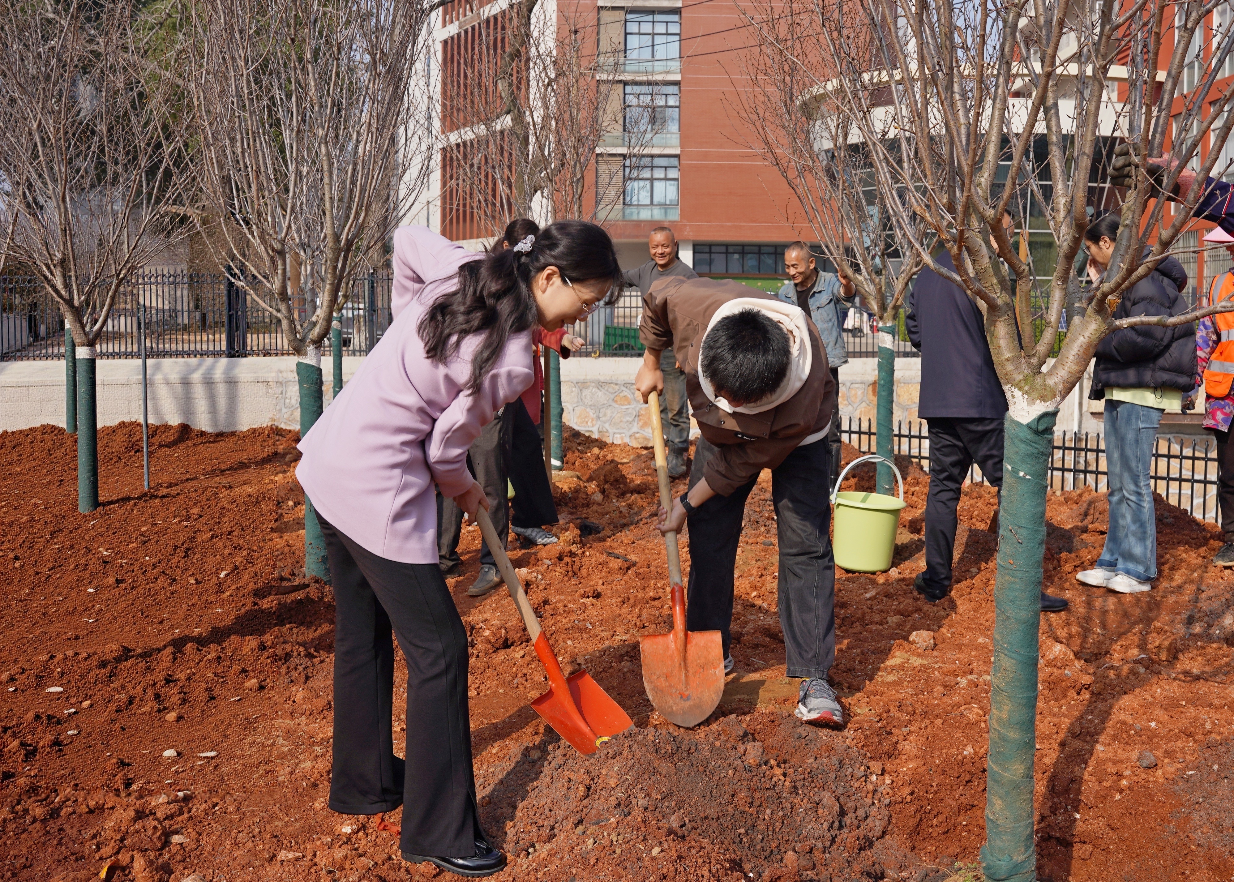 随后,校领导与学生代表自愿结成植树小组,正式投入樱花树栽种工作。大家分工协作、默契配合,严格遵循专业规范,挥锹挖坑、扶正树苗、填土压实、浇水灌溉,每一个环节都严谨细致、一丝不苟。现场气氛热烈高涨,师生们干劲十足,弯腰清理树坑杂物的专注、合力扶正树苗的坚定、悉心浇灌的温柔,尽显团结协作的精神风貌。园林技术人员全程巡回指导,及时纠正不规范操作,耐心讲解树苗养护技巧,确保每一株樱花树苗都能栽稳栽好、茁壮成长,为校园未来增添一片烂漫春色。