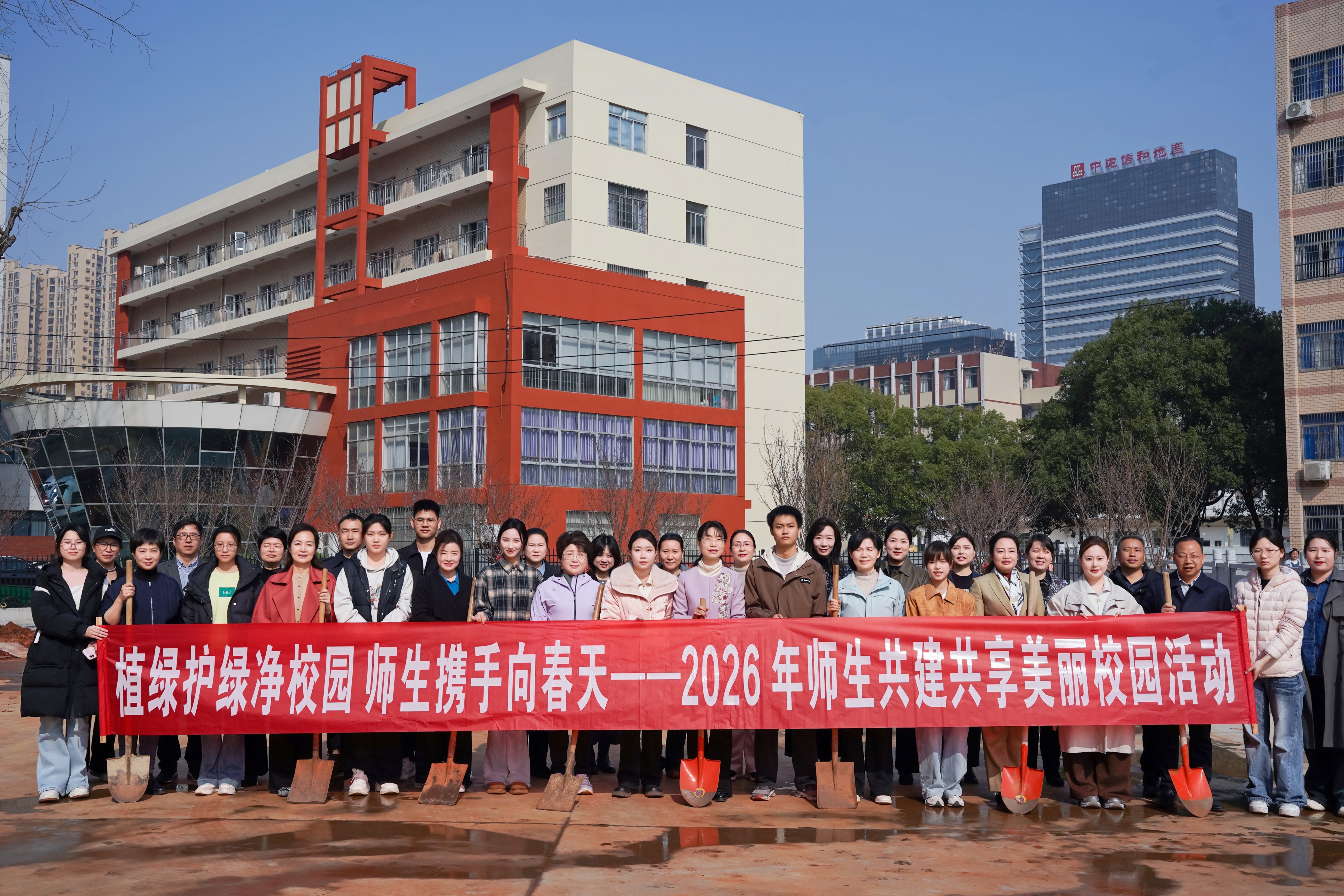 上午 9 时,绿化种植活动在南院新建球场西北角绿化预留地正式启动。活动现场,横幅飘扬、秩序井然,全体校领导、师生代表准时集结,在园林专业技术人员的指导下,有序领取铁锹、水桶、锄头、手套等劳动工具,为植树活动做好充分准备。