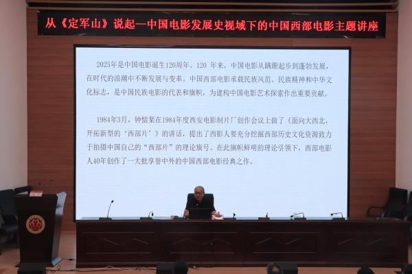 本网讯(文学与传播学院 肖云 赵三文)5月19日下午,文学与传播学院特邀陕西省文艺评论家协会主席、西北大学电影学院院长、二级教授、博士生导师、中国高校影视学会副会长张阿利来校开展主题讲座“从《定军山》说起——中国电影发展史视域下的中国西部电影”。讲座由文学与传播学院院长刘琼主持,学院党委副书记李婷婷、副院长王曙及文传院师生出席活动。