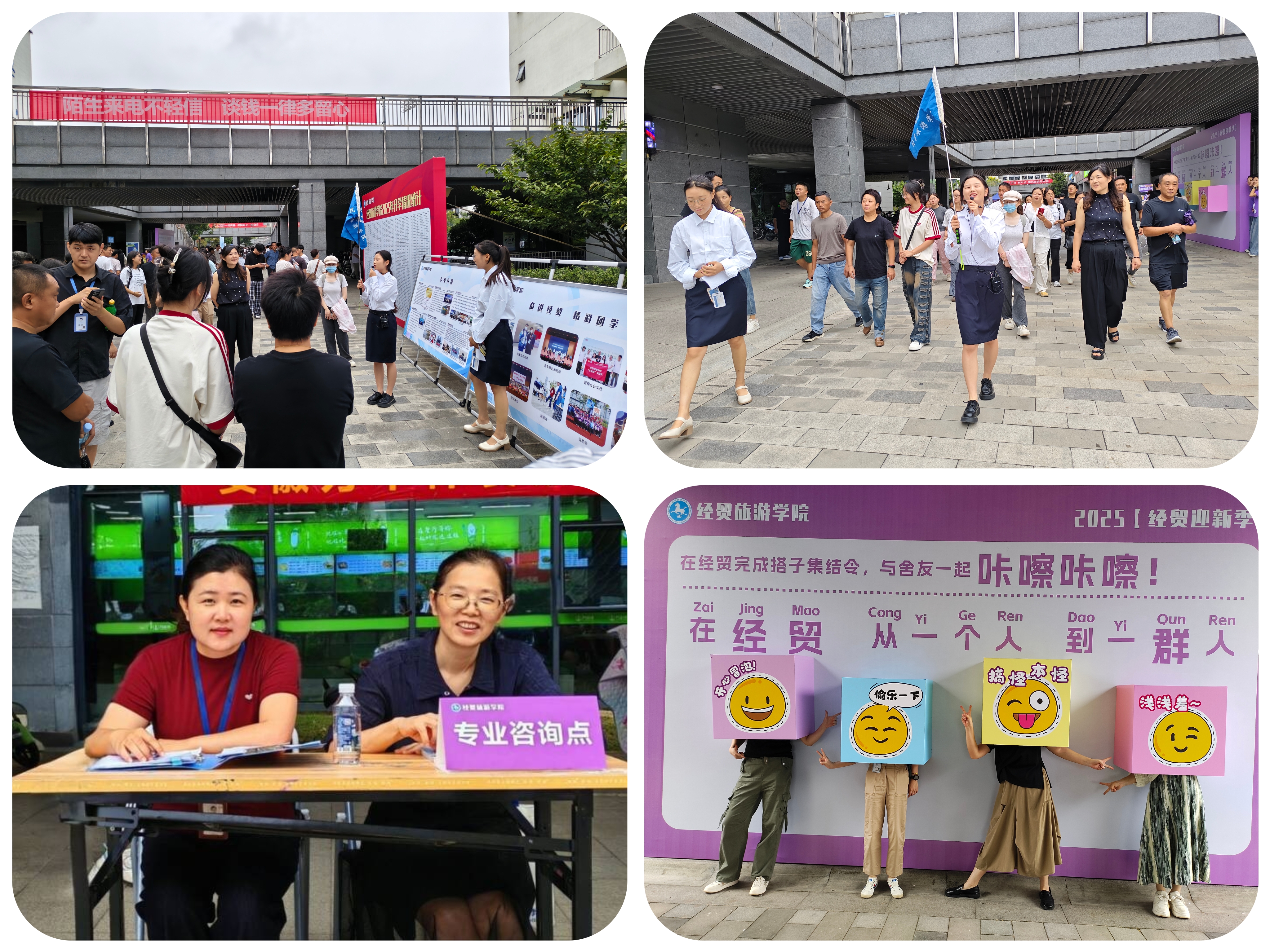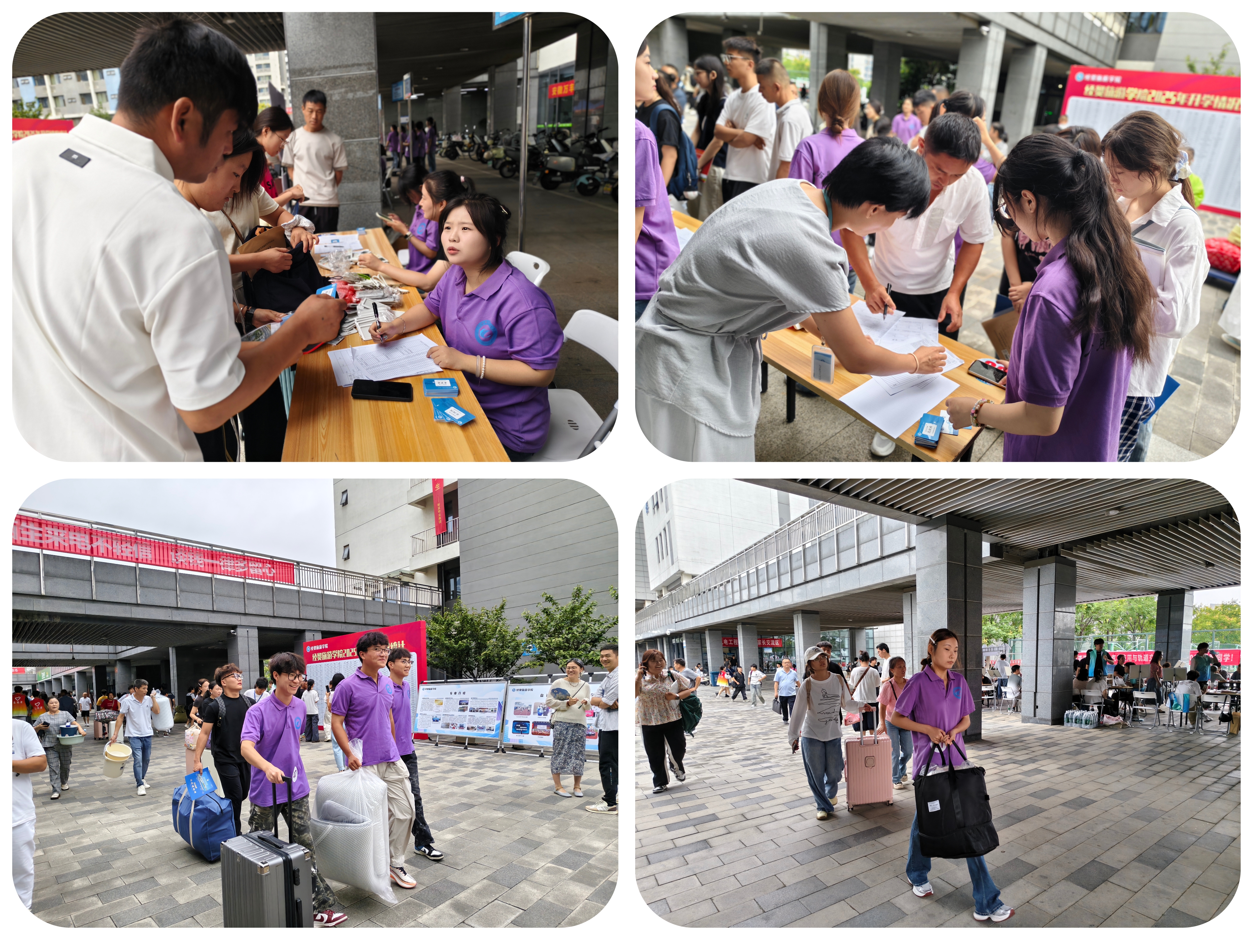 “需要帮助吗?经贸小紫为你服务!”迎新当天,身穿紫色POLO衫的志愿者们提前到岗、分工明确,全程提供“一站式”引导服务。从校门口的引导接待、行李搬运,到报到处的流程讲解、材料核验,再到宿舍区域的入住办理,“经贸小紫”志愿者们始终以饱满的热情和耐心,为每一位新生提供切实帮助,有效缓解新生初入新环境的陌生与不便,整个报到现场秩序井然。