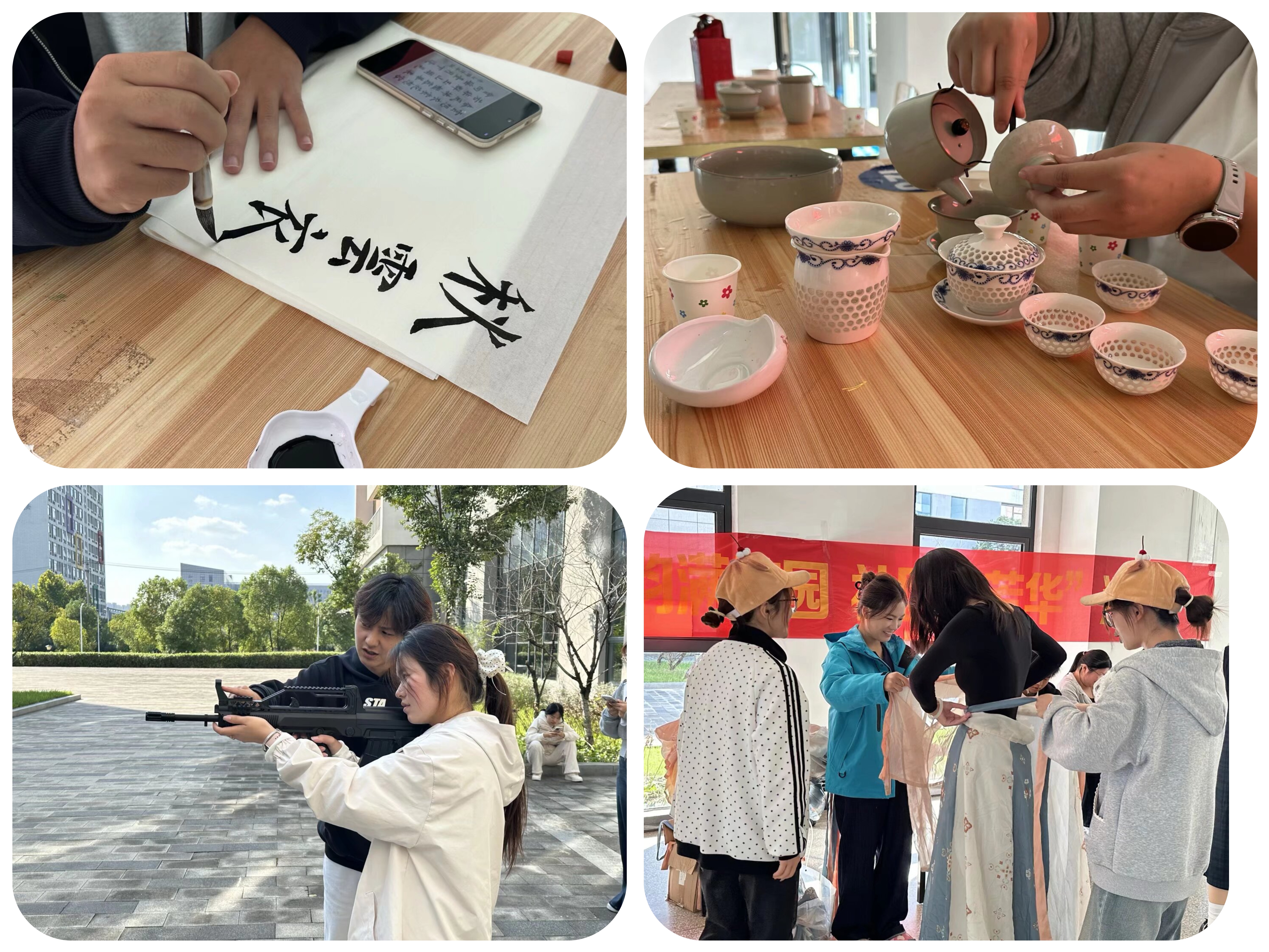 图南国学社打造的“国风体验区”吸引了众多学生驻足。书法展台前,社员挥毫泼墨,进行专业示范,同学们纷纷提笔临摹,淡淡墨香与校园桂香交织;汉服体验区里,襦裙、褙子等传统服饰吸引众人试穿,社员讲解服饰形制与文化内涵,身着汉服的身影翩然漫步,成为校园里一道流动的雅致风景;香茗区中,茶艺表演行云流水,同学们捧杯细品,感受传统茶文化的韵味。