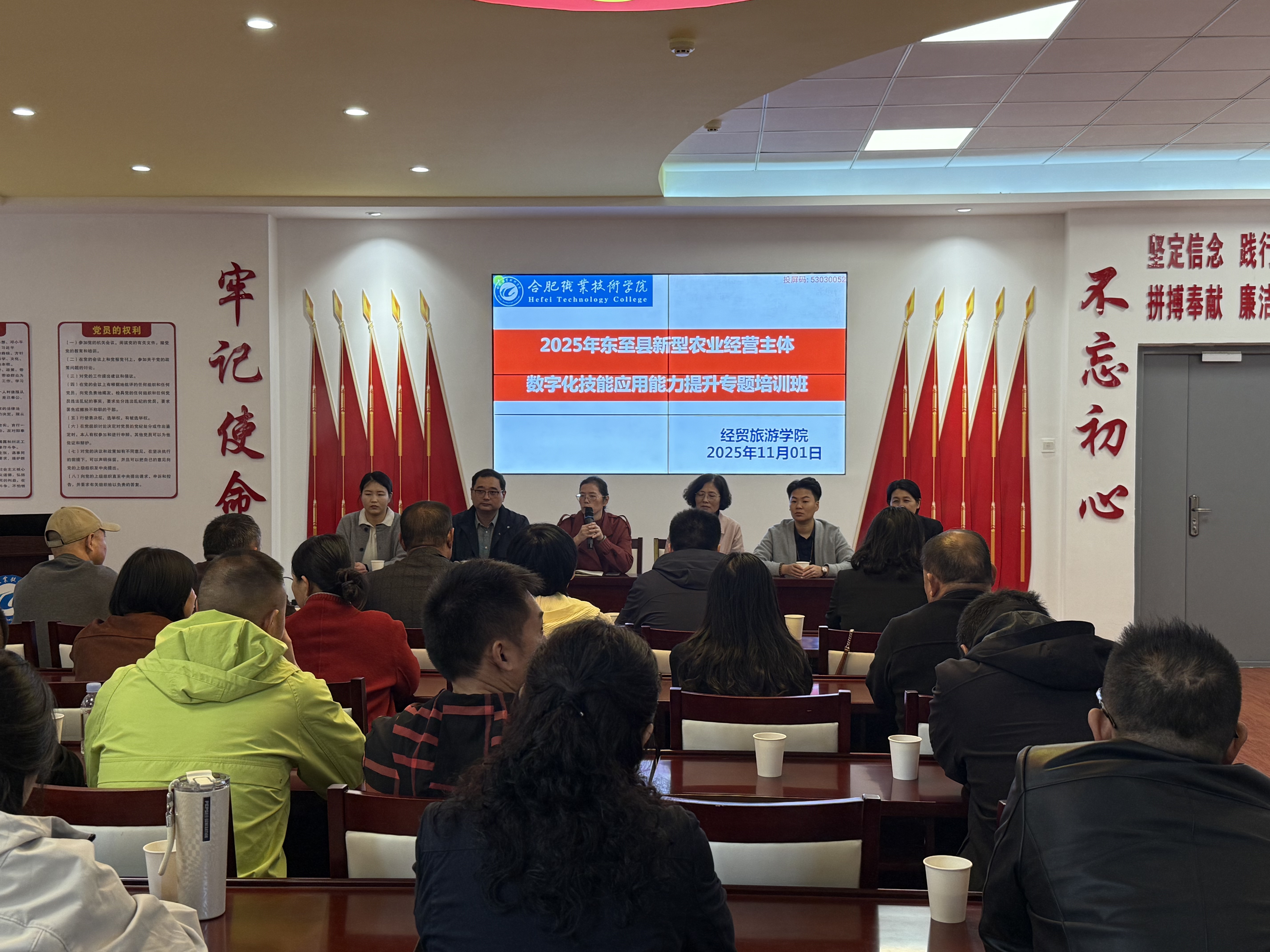 为深化数字技术与农业产业融合,助力新型农业经营主体提升数字化应用技能,11月1日,由池州市江南职业培训学校承办的“2025年东至县新型农业经营主体数字化技能应用能力提升专题培训班”实践实训在合肥职业技术学院ac米兰官网中文网站正式启动。学院电子商务教研室主任、校企合作企业代表及优秀学生代表参与开班式,与来自东至县的新型农业经营主体负责人共探电商赋能农业发展新路径。