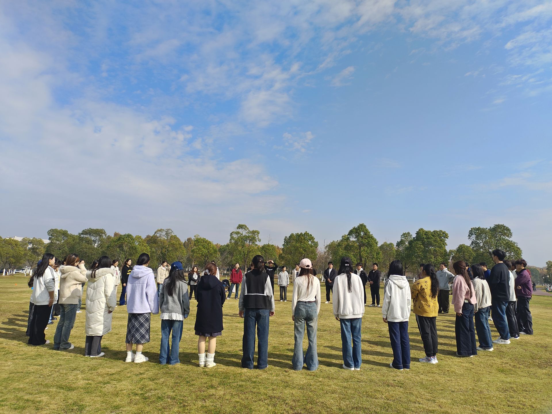 11月23日下午,沐浴着初冬的暖阳,学生干部们齐聚方兴湖体育公园。活动伊始,一系列精心设计的暖身游戏迅速点燃了现场气氛。“贪吃蛇”游戏中,同学们两两相对,在简短的自我介绍后通过“猜丁壳”决定归属,队伍如长龙般不断延伸汇聚,最终围成象征团圆的大圈,在轻松的互相按摩中消融了最初的陌生感。“桃花朵朵开”与“心有千千结”则进一步促进了随机分组成员间的快速熟悉与默契培养,现场欢声笑语不断,有效拉近了彼此的距离。