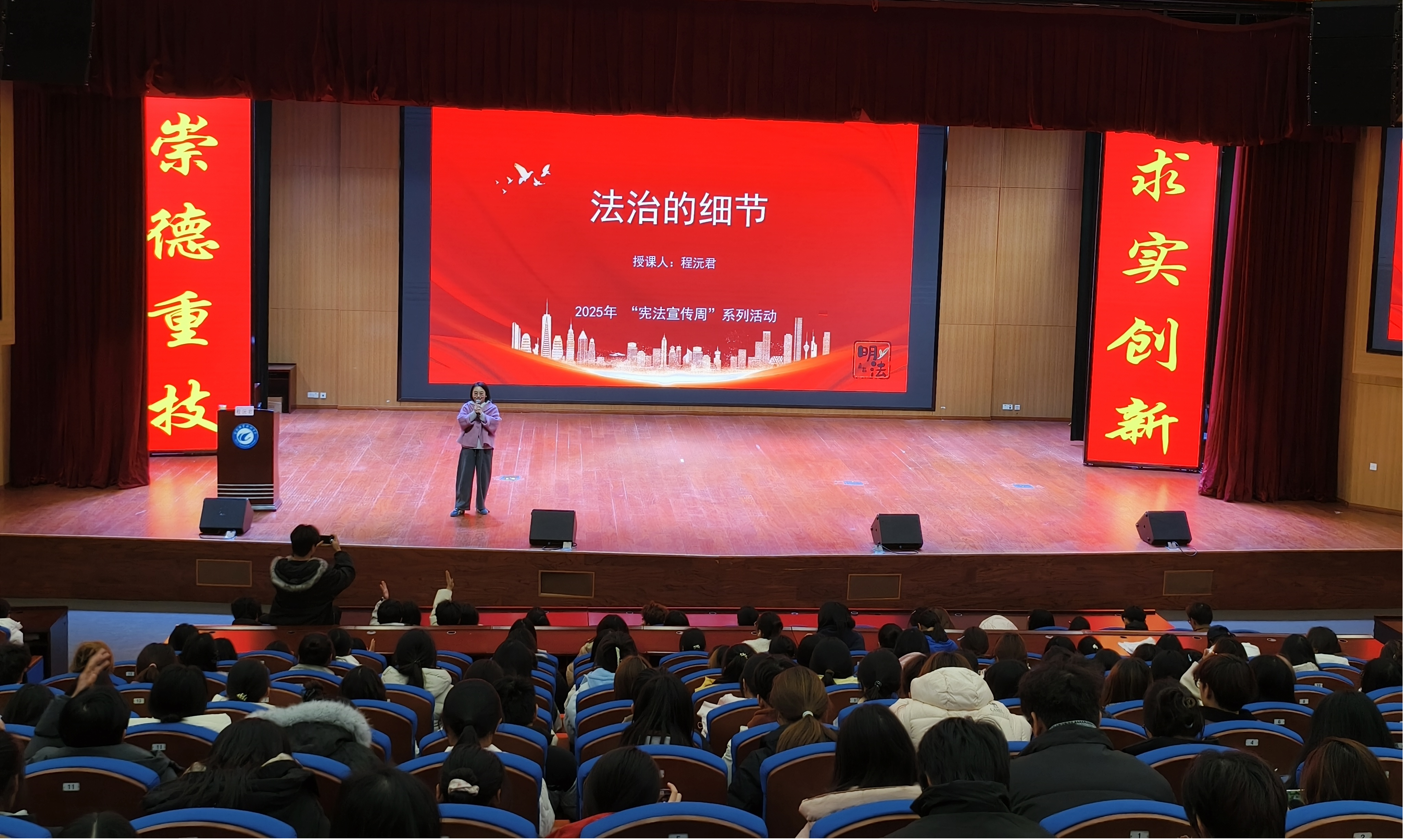 讲座中,程沅君老师以《法治的细节》为主题,紧扣“学习宣传贯彻习近平法治思想,推动宪法深入人心”的宣传周主题,从宪法作为国家根本法的地位出发,结合《中华人民共和国宪法》中公民基本权利与义务的核心条款,用“宪法条文+生活实例”的形式拆解法律知识。她聚焦大学生群体高频法律场景,围绕宪法保障下的受教育权、人身自由、财产权等权益,针对校园欺凌、网络诈骗、兼职就业纠纷等热点问题,通过典型案例剖析风险点,详解防范技巧与维权路径,让“宪法并非高高在上,而是贴近日常”的理念深入人心。
