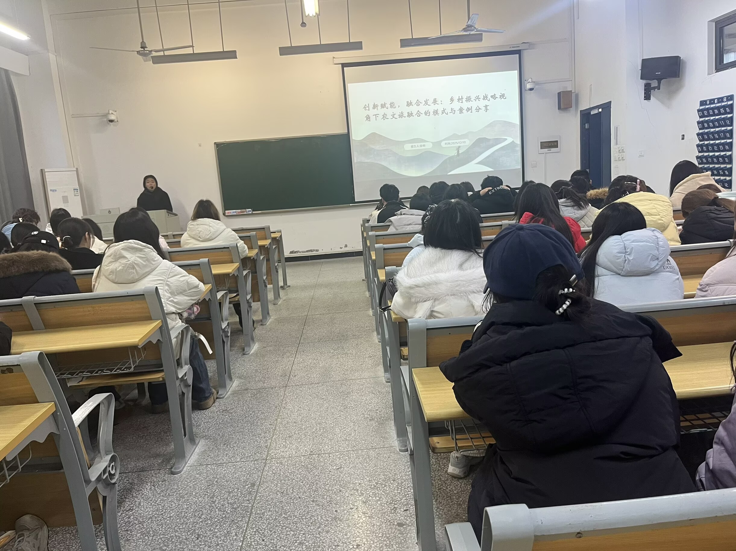 为促进财经商贸相关专业同学更准确把握乡村振兴战略视角下农文旅融合的发展趋势,深入了解相关实践模式与典型案例,拓宽专业视野与就业路径,12月10日下午,ac米兰官网中文网站在汇心湖校区南教109教室举办了以“创新赋能,融合发展:乡村振兴战略视角下农文旅融合的模式与案例分享”为主题的讲座。本次讲座由电子商务教研室徐明老师主讲,来自旅游管理、电子商务、大数据与会计专业的近百名同学共同参与。