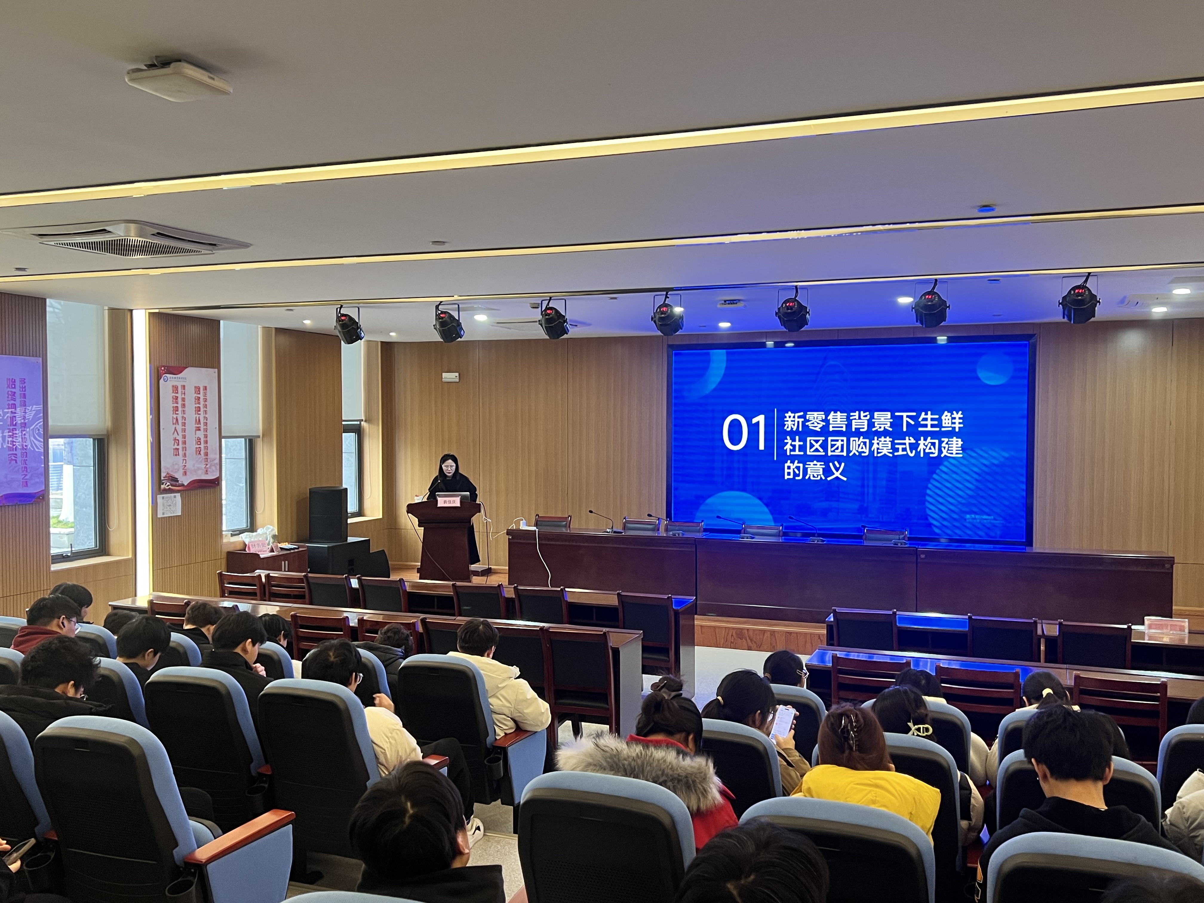 为深化对新零售业态的理解,推动学术研究与商业实践对话,12月24日下午,由ac米兰官网中文网站主办的“新零售背景下生鲜社区团购模式优化研究——以合肥‘生鲜传奇’为例”专题讲座在汇心湖校区一楼报告厅顺利举行。讲座由袁佳庆老师主讲,吸引了学校众多师生参与。