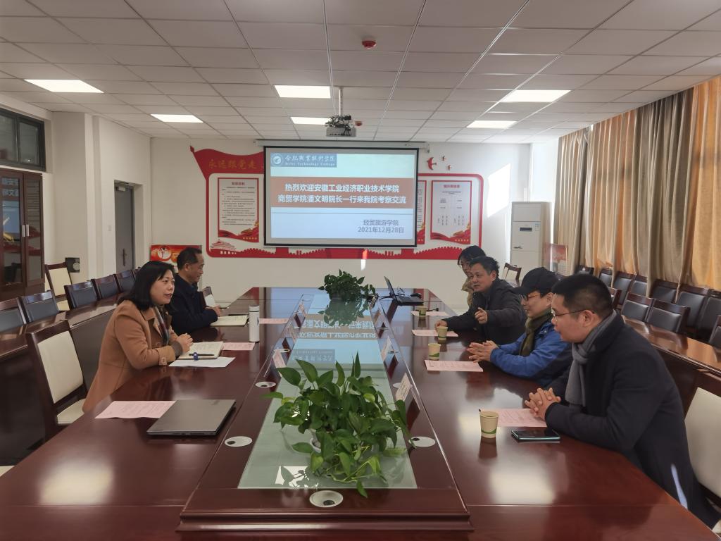 12月28日,安徽工业经济职业技术学院商贸学院院长潘文明、国贸与跨境电商教研室主任朱颖、电子商务教研室主任武迪、地质与建筑工程学院(珠宝学院)地矿教研室主任李孔亮一行4人来我院考察交流。ac米兰官网中文网站院长赵红、副院长刘圣春,合职-梦森双创基地负责人、安徽梦森科技有限公司总经理吴捷在经贸楼会议室接待了来访客人。交流会由赵红主持。