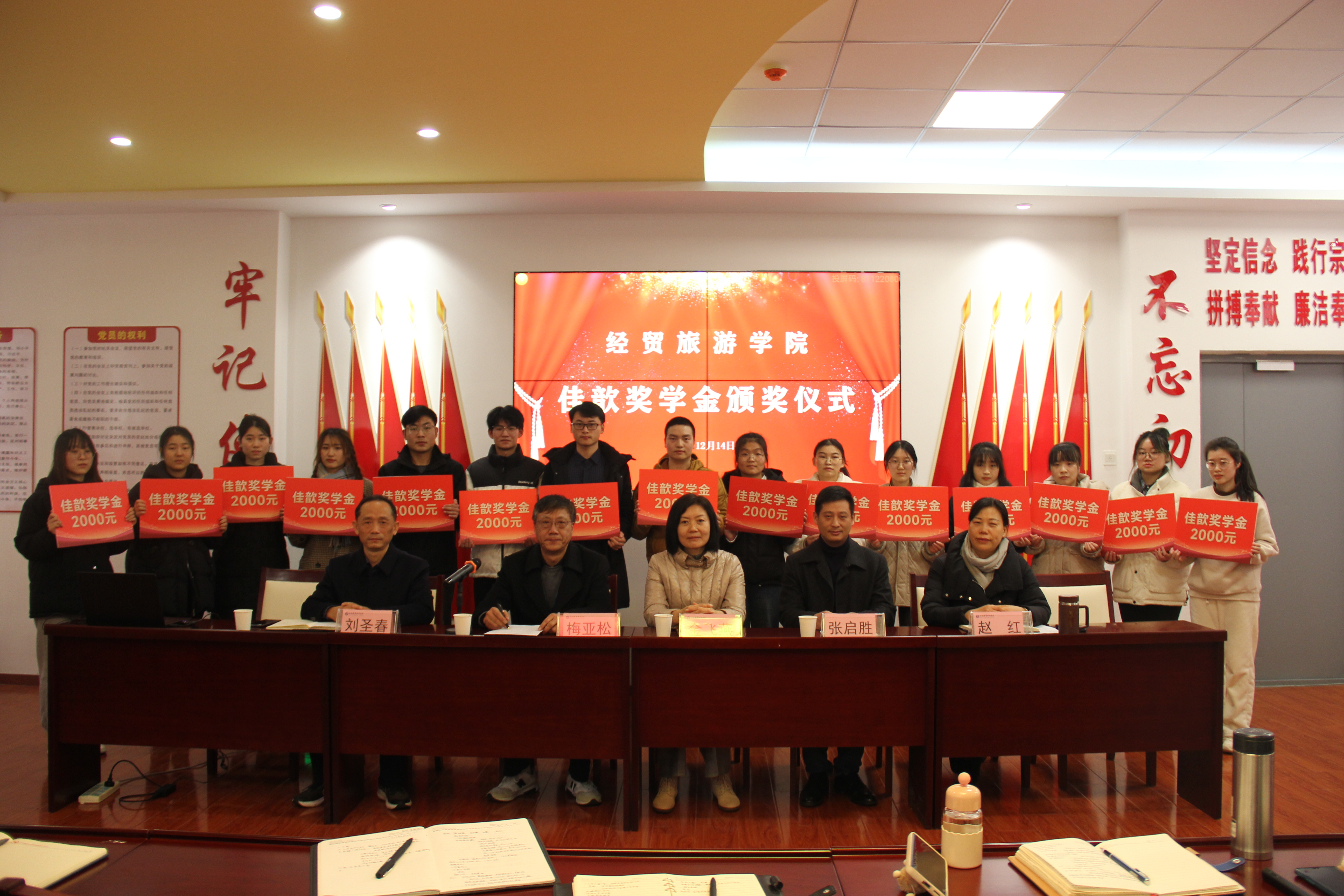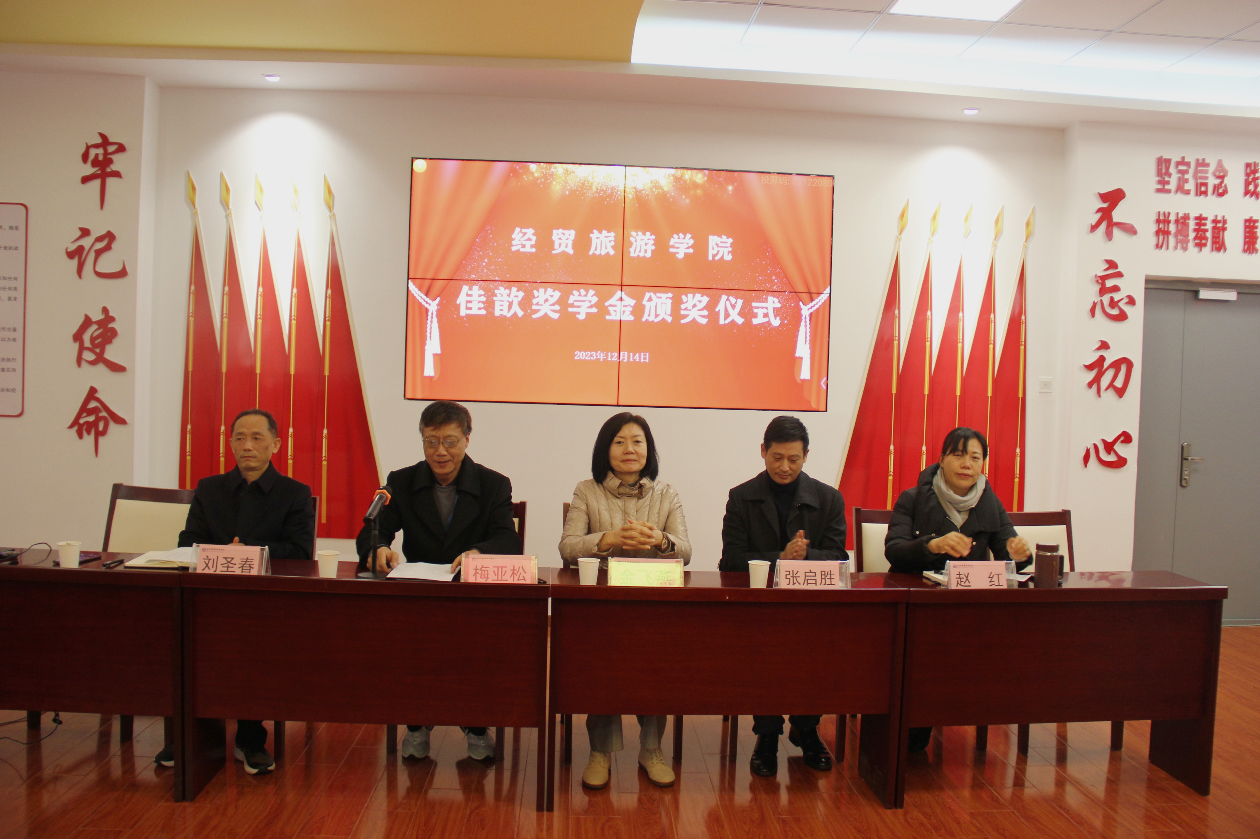 学院院长赵红在致辞中对张启胜董事长表达了诚挚感谢,并介绍了学院近年来的发展成果和亮点:一是深化专业改革,提高人才培养质量;二是学院2023年就业目标考核优秀,就业率达99%;三是技能大赛取得新突破,会计专业团队荣获国赛二等奖;四是教师的教学科研能力提升,突出立德树人。她指出,同学们要珍惜在校时光,回归大学本源,努力学好专业技能,立志成才。学院党总支副书记刘圣春宣读了获得此次“佳歆”奖学金的学生名单。学院获奖学生代表22旅管2班都江龙同学上台发言,感谢张启胜学长一直以来对经贸学子的关心与支持,并表示要继续发挥榜样作用,用自己的实际行动去影响身边同学。