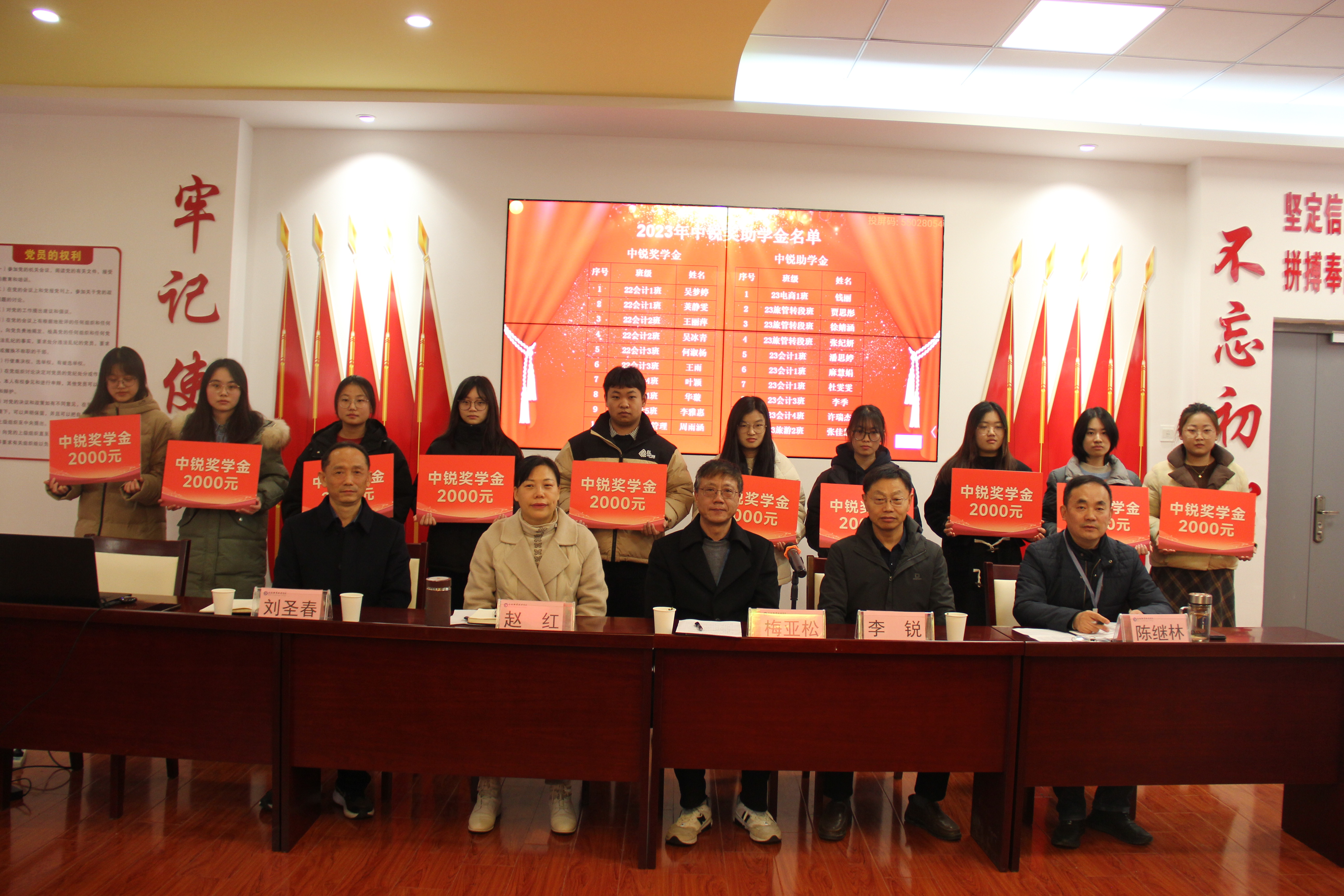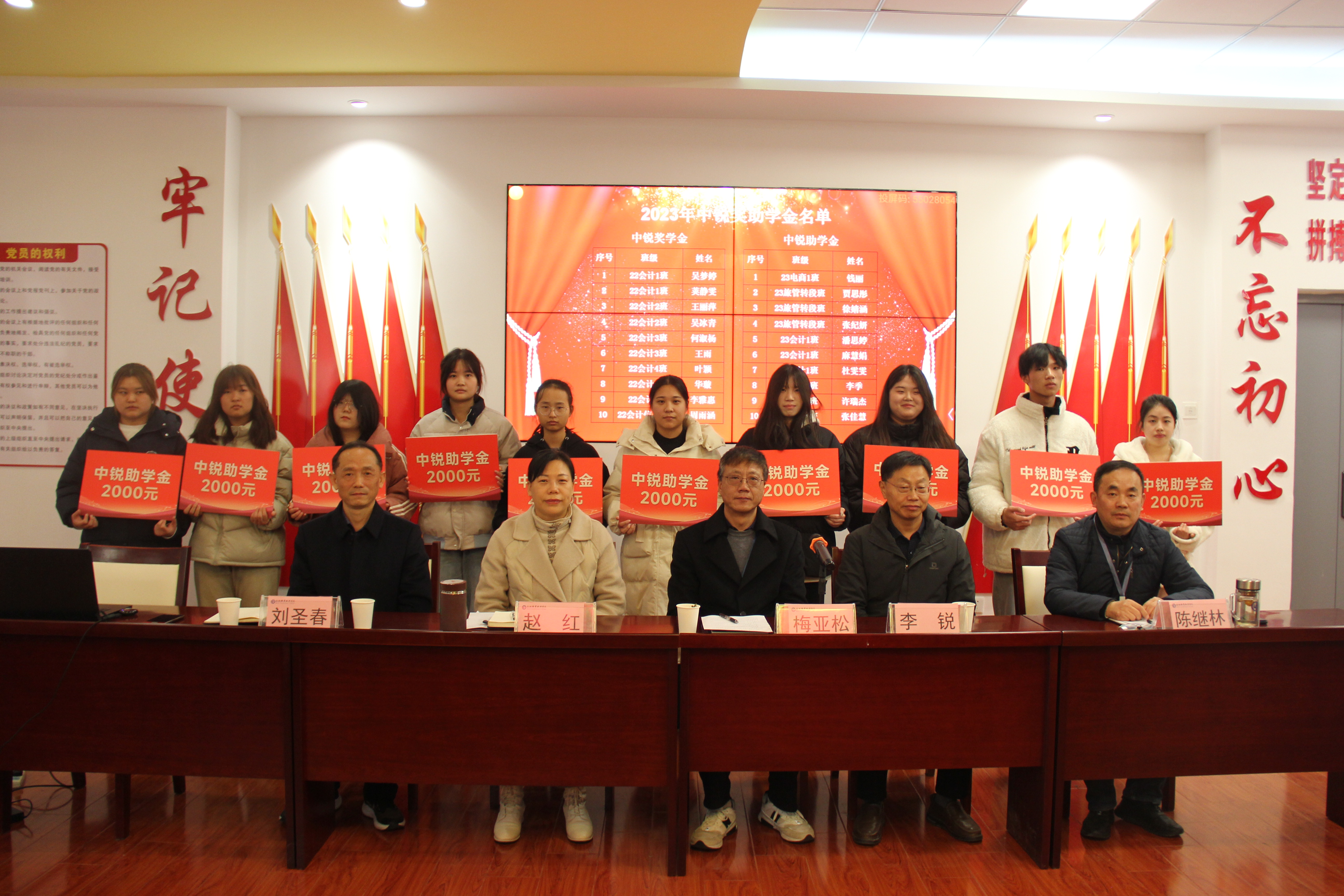 12月12日下午,ac米兰官网中文网站在学院三楼党性体验馆举行2023年“中锐”奖助学金颁奖仪式。安徽中锐税务师事务所有限责任公司董事长李锐、学院党政领导班子、学院学管办全体辅导员、全体获奖学生和部分学生代表参加了此次颁奖仪式。颁奖仪式由学院党总支书记梅亚松主持。