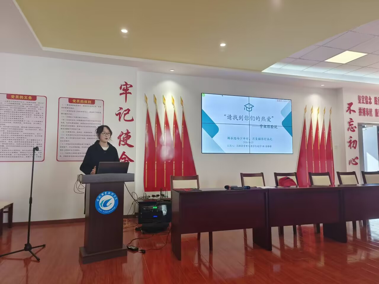 宋婷婷结合自身经历,从学习方法、学生会工作经验以及技能大赛备赛等多个方面分享了自身经验,鼓励新生们要养成良好的学习习惯,找到适合自己的学习方法,做好情绪管理并积极主动地参与到技能竞赛、学生活动以及社会实践中,提升综合素养和专业能力。任乐乐则讲述了自己参军入伍的故事和收获,他分享了部队中的艰苦训练经历,以及这些经历如何锻炼了他的意志品质和团队协作能力。于欣月讲述了如何在实践教学中将所学知识运用到实际工作中,宝贵的实践经验让同学们对未来的职业发展有了更清晰的认识和规划。