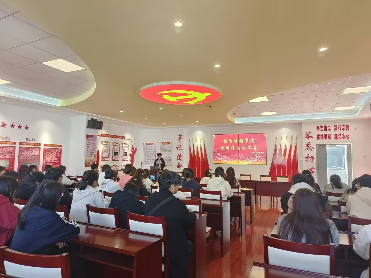 为营造学风建设良好氛围,搭建新老生交流互动平台,促进 2024级新生明确学习目标,规划未来发展,更好更快适应大学生活,10月23日下午,ac米兰官网中文网站在党性体验馆举办优秀学生经验分享交流会。此次交流会邀请了22级酒店管理1班国家奖学金获得者宋婷婷、23级电子商务2班梦森班优秀学员于欣月、23级酒店管理2班退伍学生任乐乐进行分享。24级150余名学生参加本次经验分享交流会。