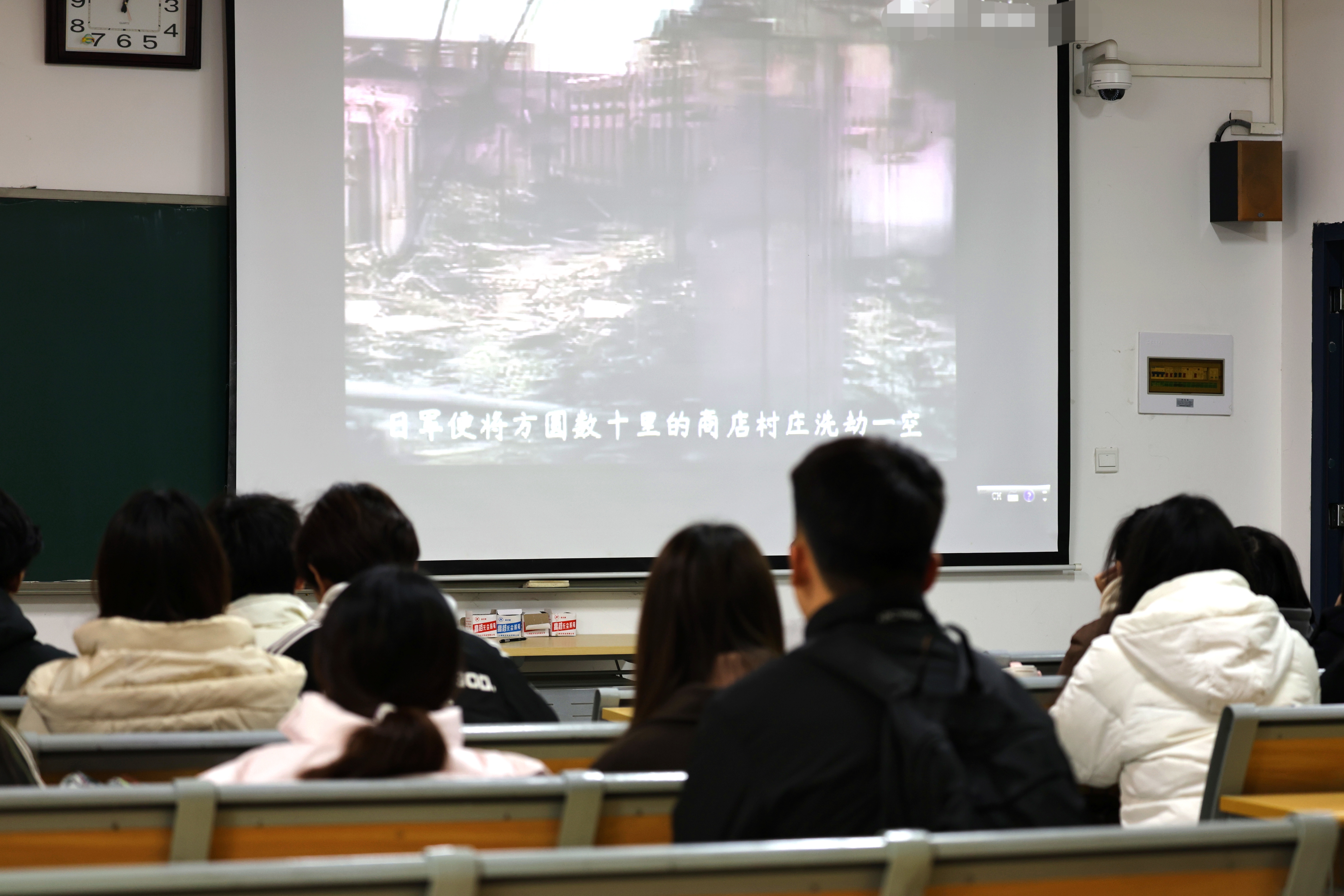 重温历史,勿忘国耻。上午11时50分,在社团骨干的组织下,大家在教学南楼111教室一同观看了南京大屠杀真实历史影像纪录片,观影现场同学们心情沉重,影片中侵华日军烧杀抢掠的惨烈画面和无辜百姓绝望的挣扎让人内心深受震撼。