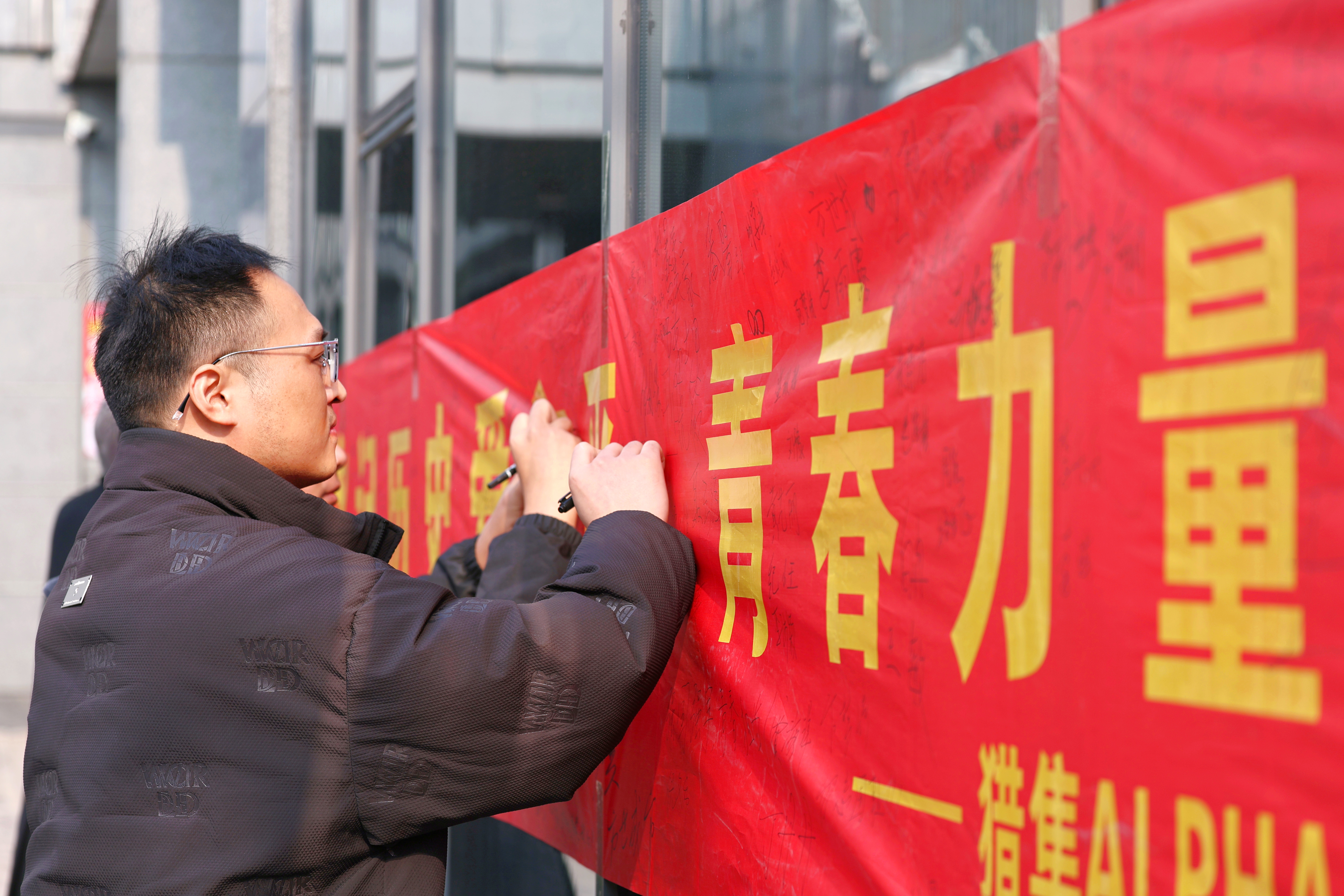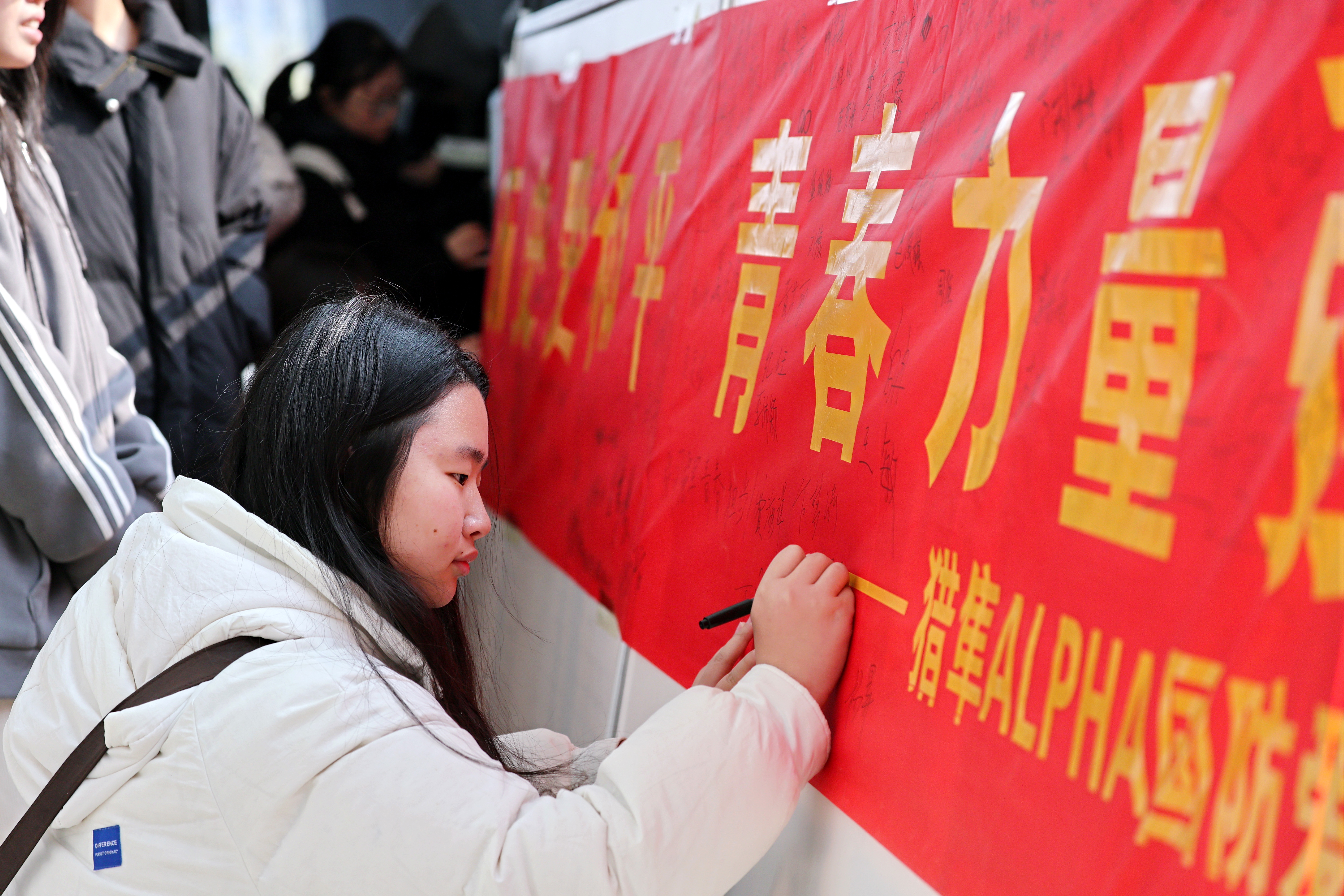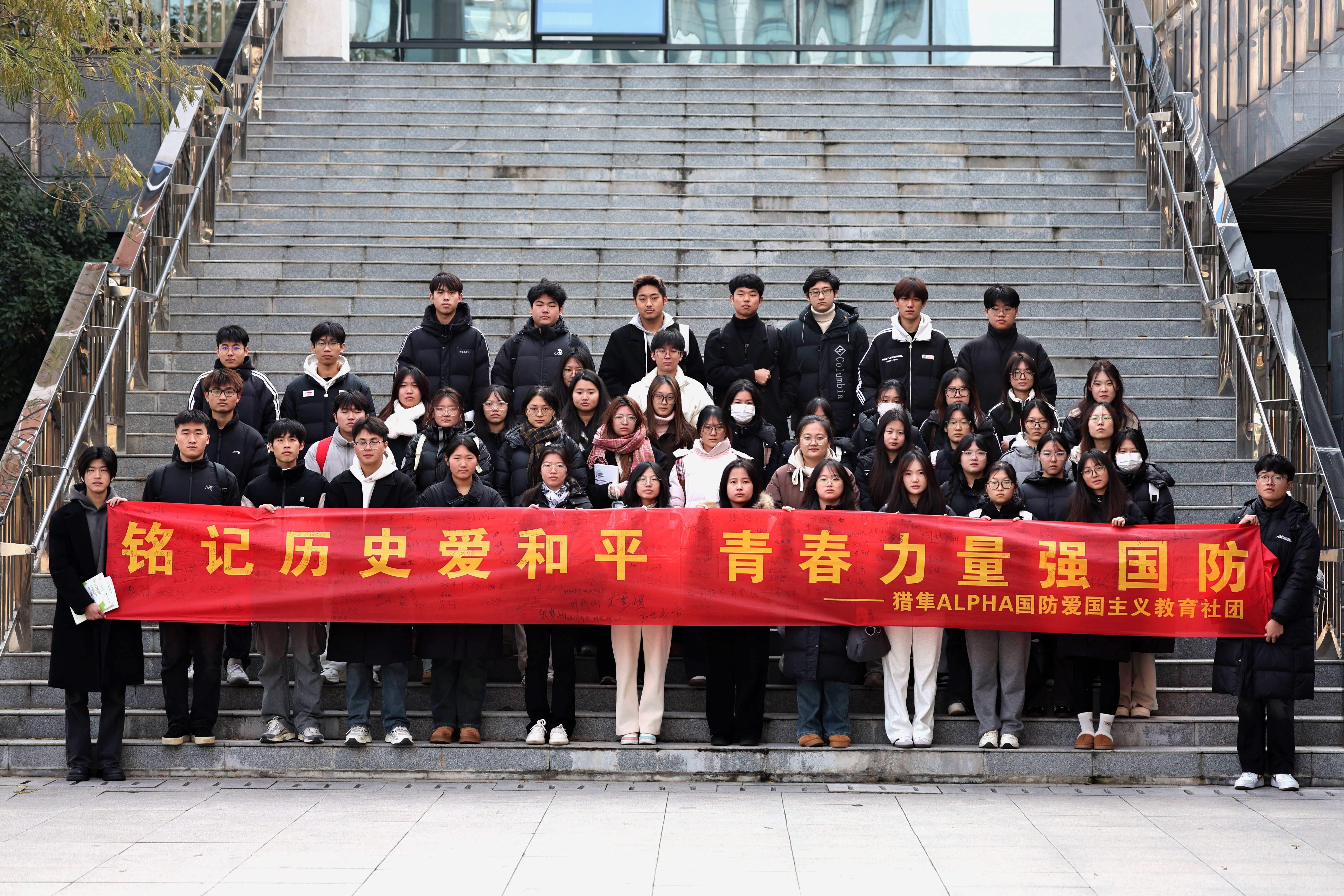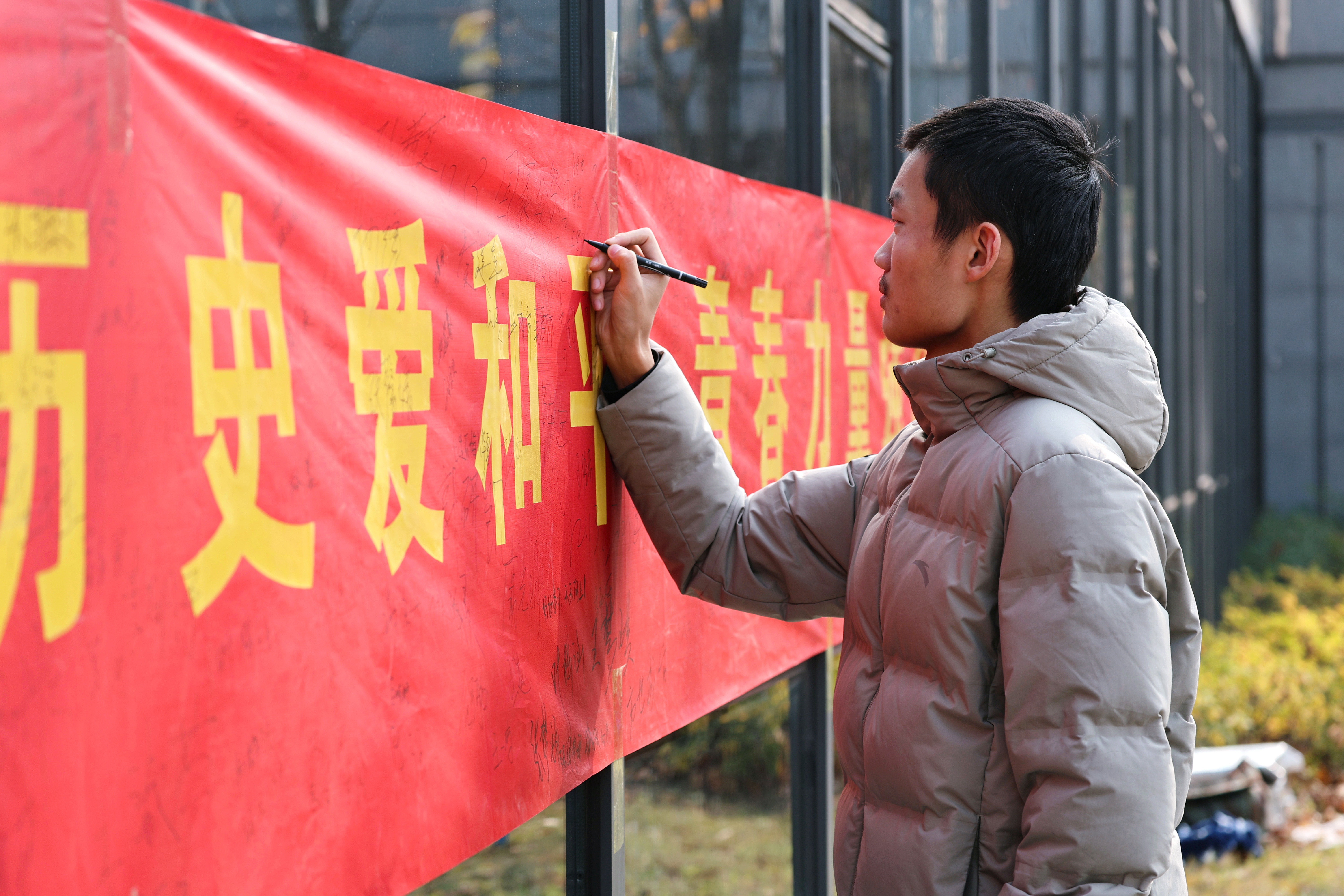 强国强军,青春担当。南京大屠杀的悲剧昭示我们,落后就要挨打,只有强国强军,才能安国兴邦。利用上午和中午的课余时间,社团在教学南楼一楼大厅和大学生活动中心广场举行了横幅签字活动,师生们在纪念横幅上写下自己的名字和留言,立志让青春身影奋力奔跑在强国发展需要的每一领域,让青春力量绽放在保卫祖国的热血军营!