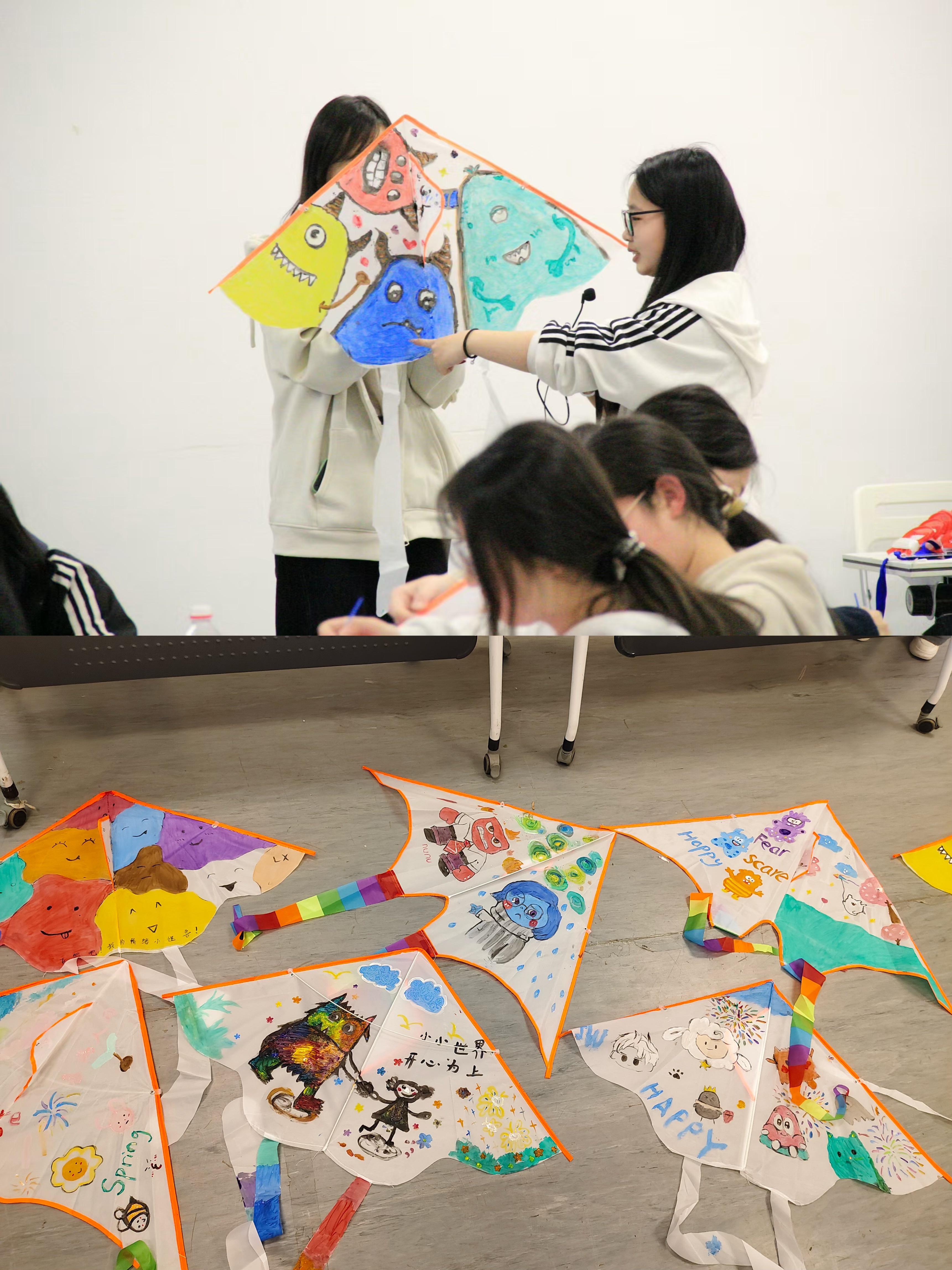 在绘本的启发下,同学们领取空白风筝和彩绘材料,开始创作属于自己的“情绪小怪兽”。有人用明快的黄色勾勒出快乐的笑脸,有人用深蓝色描绘忧郁的云朵,还有人将多种色彩交织,展现情绪的复杂变化。活动现场欢声笑语,大家尽情发挥想象力,让心中的情绪跃然纸上。