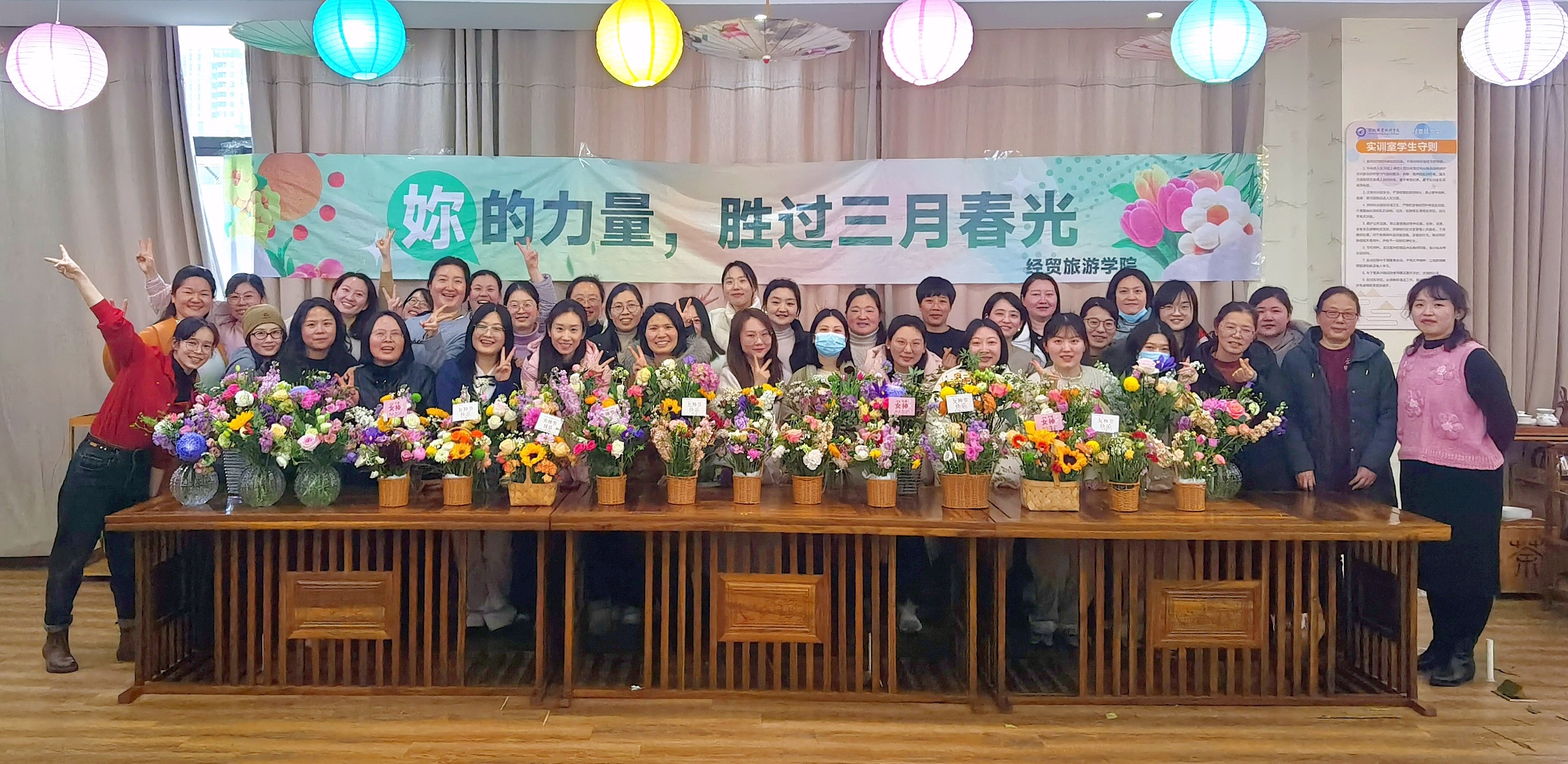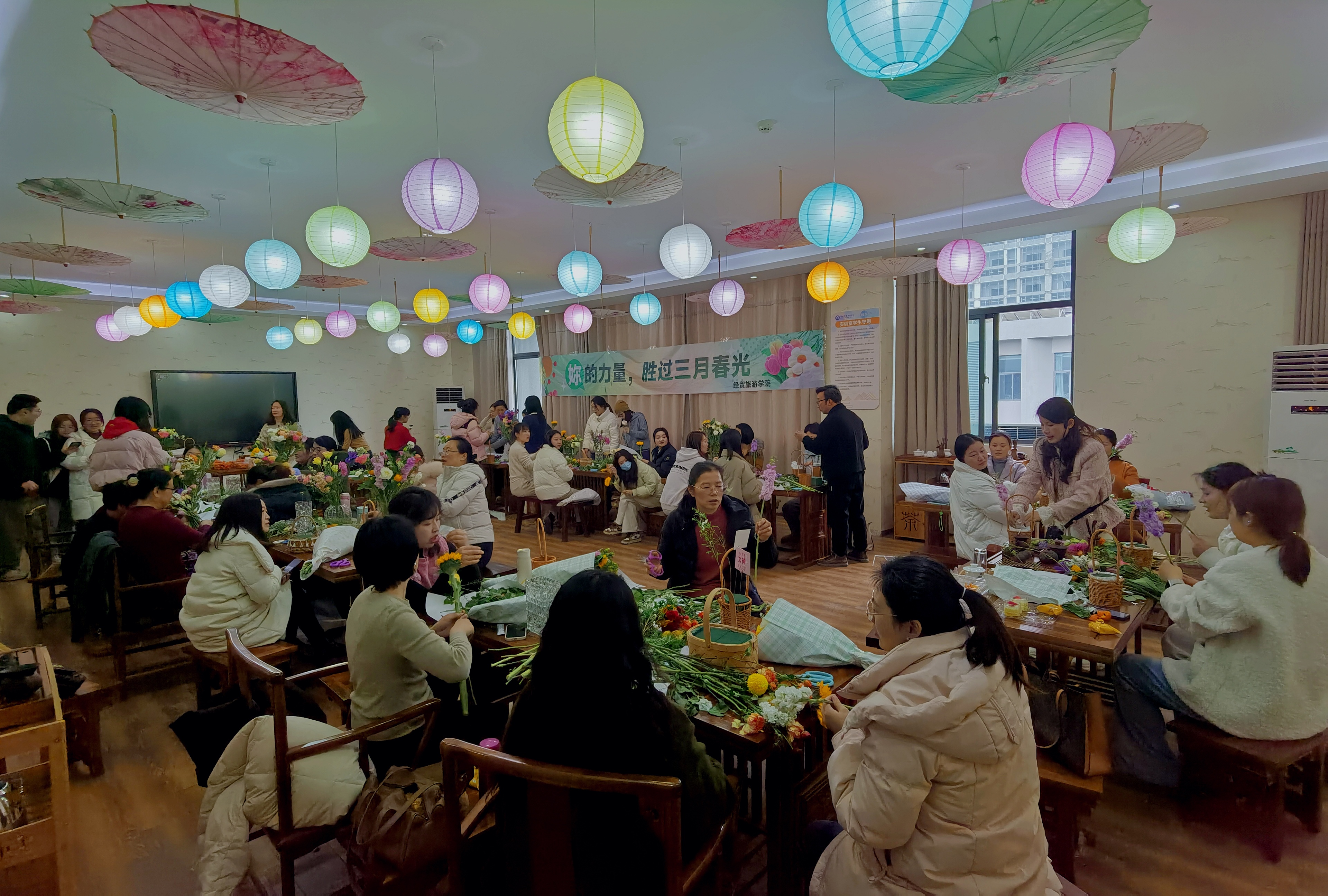 品茶、插花、交流,释放工作生活压力,共享艺术之美。为庆祝"三八"国际劳动妇女节的到来,3月5日下午,ac米兰官网中文网站分工会在茶艺实训室举办主题花艺手作活动。学院党政班子到场祝贺,40余名女教职工共赴春日花事,以花为媒共享节日祝福。
