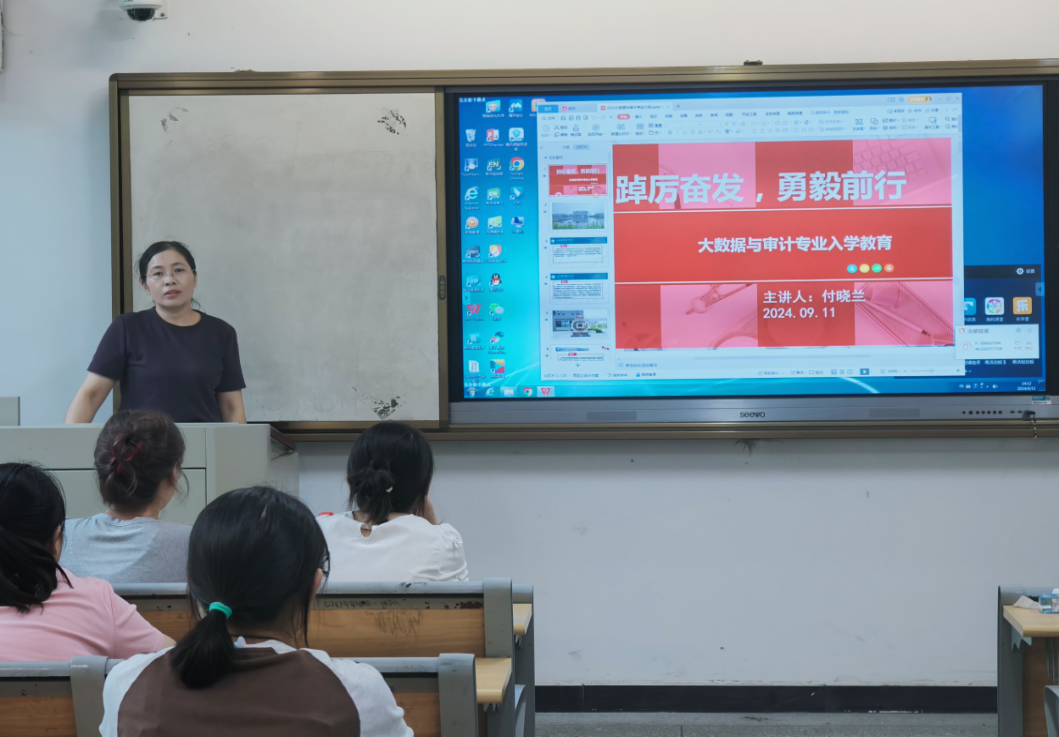 9月11日下午14:00,ac米兰官网中文网站付晓兰教授在汇心湖校区南教学楼101教室组织开展了名为“踔厉奋发,勇毅前行”的2024级大数据与审计专业新生入学教育专题讲座。