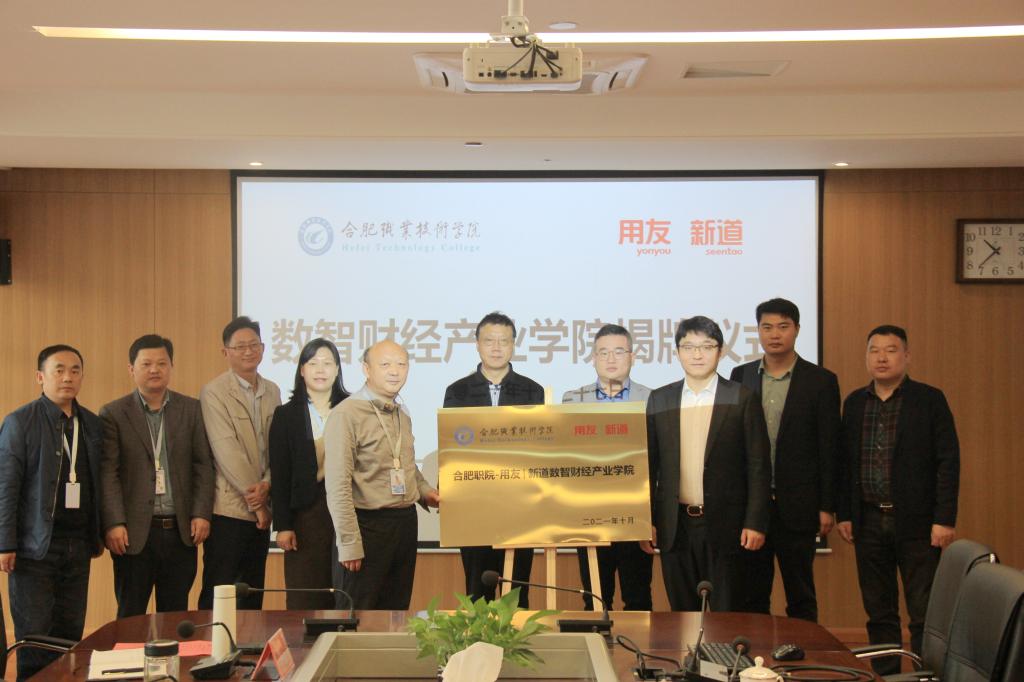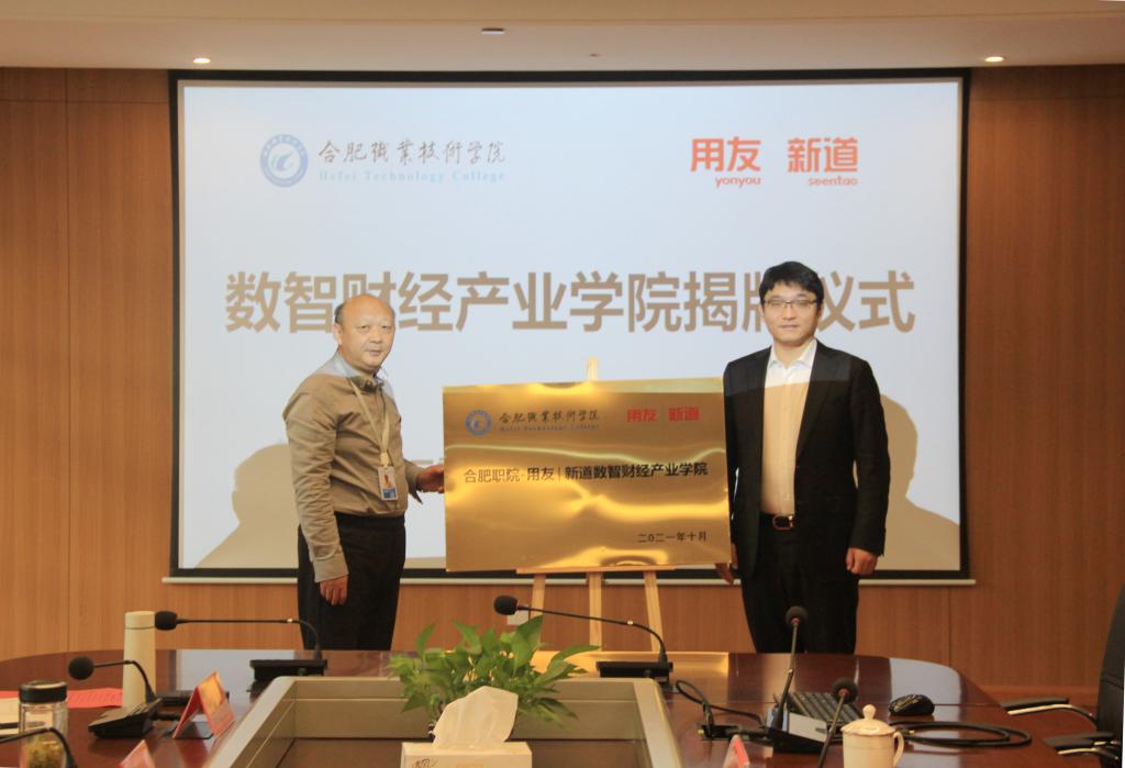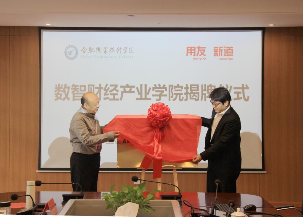之后,在与会人员的共同见证下,副校长周晓隆和新道科技股份有限公司副总裁贾大明为“合肥职业技术学院--用友新道数智财经产业学院”揭牌。