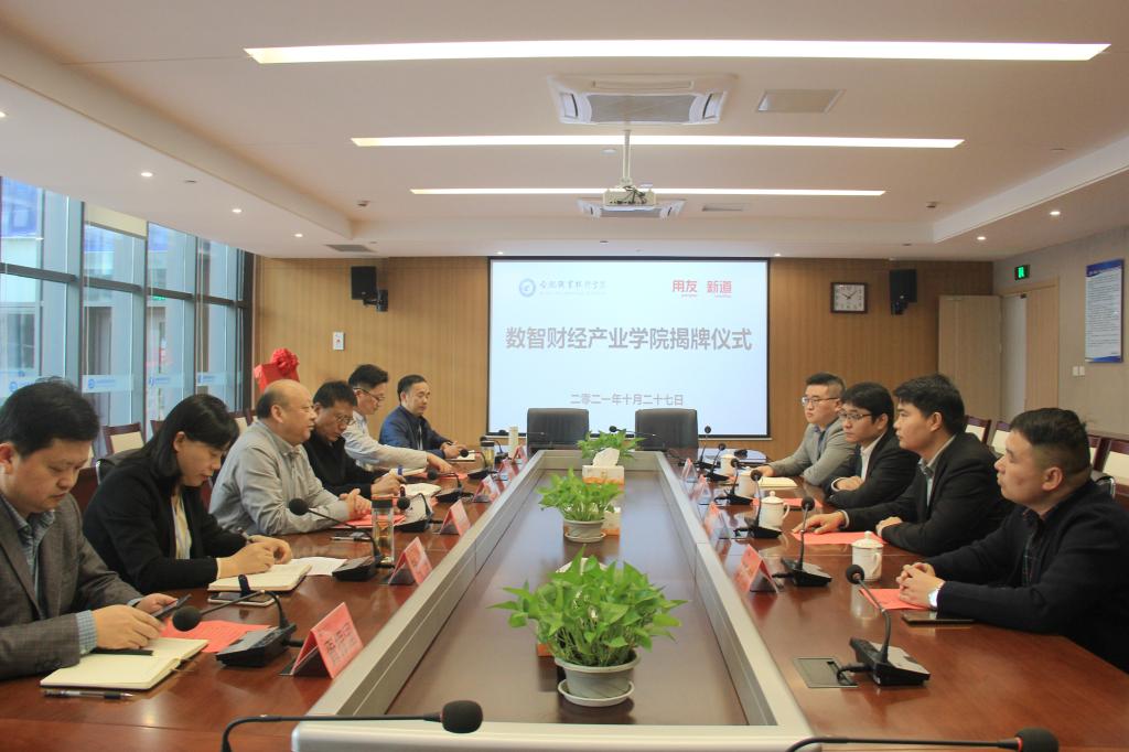 10月27日,合肥职业技术学院--用友新道数智财经产业学院揭牌仪式在我校汇心湖校区图书馆525会议室举行。我校党委委员、副校长周晓隆,ac米兰官网中文网站党总支书记梅亚松,ac米兰官网中文网站院长赵红,教务处副处长窦红平(主持工作),科技处处长胥振国,ac米兰官网中文网站副院长陈继林,新道科技股份有限公司副总裁贾大明,苏州蔚盛网络科技有限公司总经理王雷,新道科技股份有限公司安徽省区总经理吕京波,新道科技股份有限公司安徽省区校企合作总监康阿朋出席本次揭牌仪式。仪式由赵红院长主持。