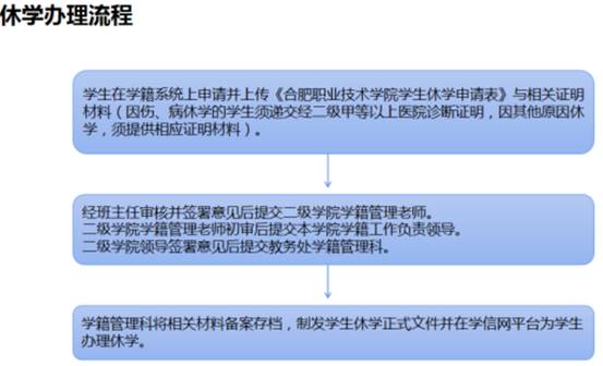 (1)学生在学籍系统上申请并上传《合肥职业技术学院学生休学申请表》与相关证明材料(因伤、病休学的学生须递交经二级甲等以上医院诊断证明,因其他原因休学,须提供相应证明材料)。