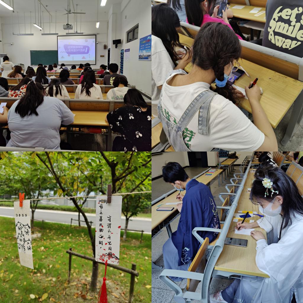5月25日下午,学院在教学南楼111教室举办了“心阳光 心绽放”主题心灵书签DIY的活动。活动主要分为两个部分:一是学生在精美空白书签上写上符合主题的词句,二是致未来自己的明信片。活动目的在于通过心灵书签的设计配上有力量的文字,表达自己给予自己的爱。另外,在明信片上写下给未来的自己的话,学院心理部的同学将通过QQ群在来年的5月25日带领大家一起回忆今日的美好。