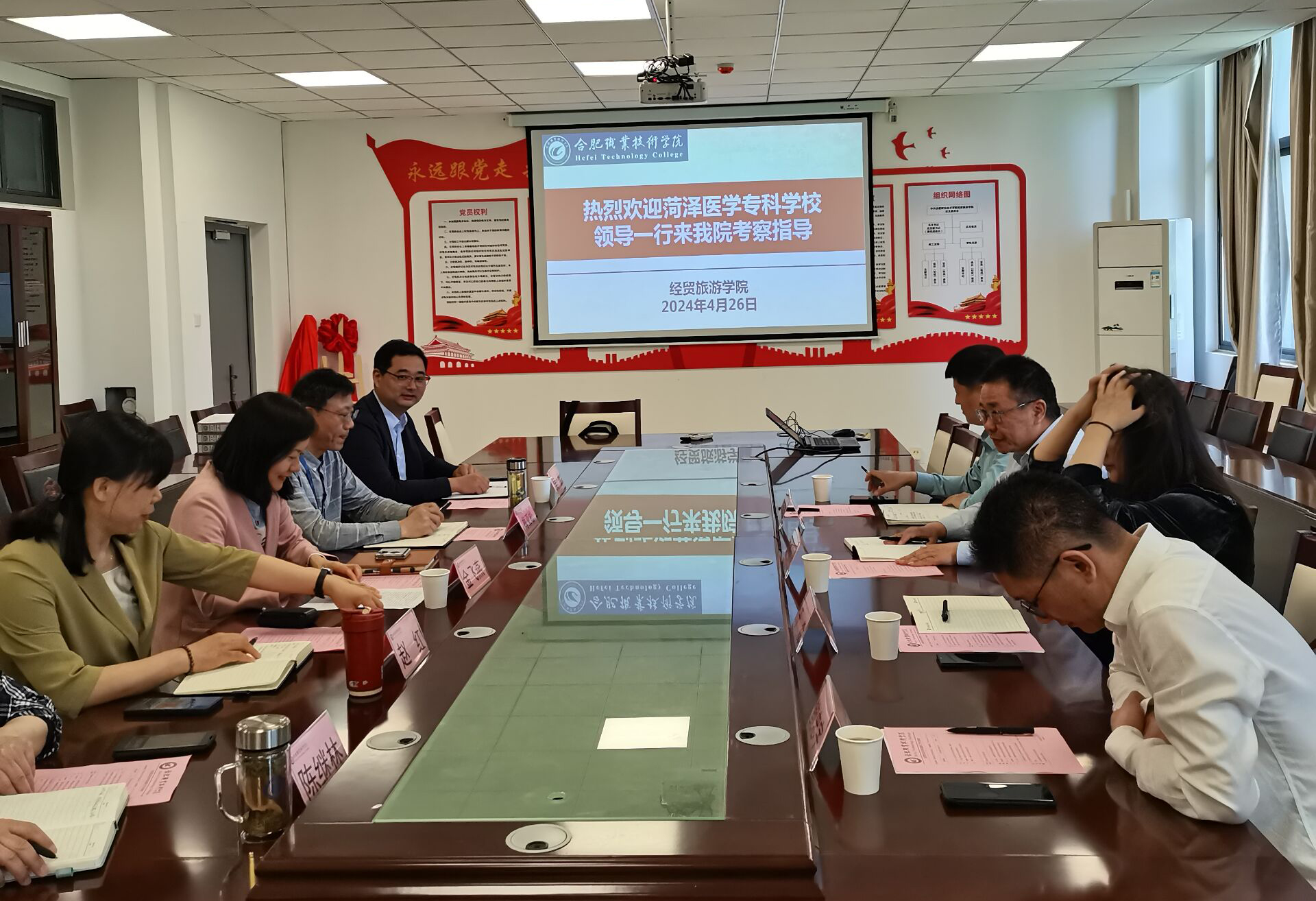 4月26日上午,山东菏泽医学专科学校党委委员、副校长齐云飞,校团委书记于淼,学生工作处副处长刘建海,济南市仁客创业服务总经理鲍忠宇等一行四人就创新创业工作来我校ac米兰官网中文网站开展调研交流。校党委副书记金飞燕、ac米兰官网中文网站党总支书记梅亚松、院长赵红、副院长陈继林、安徽梦森科技有限公司董事长吴捷等在经贸南楼会议室接待了来访客人。