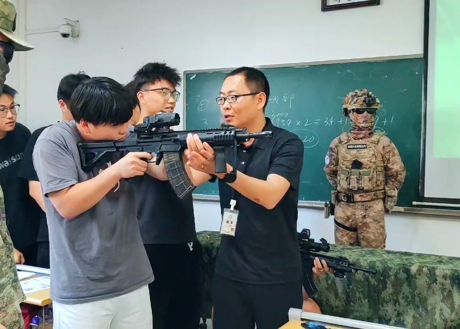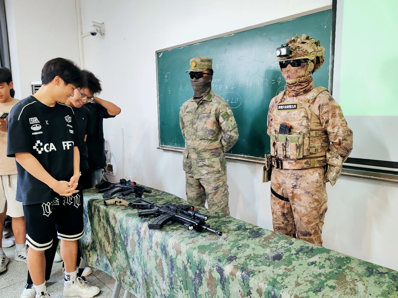 此外,活动现场还进行了单兵作战装备道具模型展示和激光模拟打靶活动。同学们纷纷走上台,体验模拟射击,与展示模特合影留念。