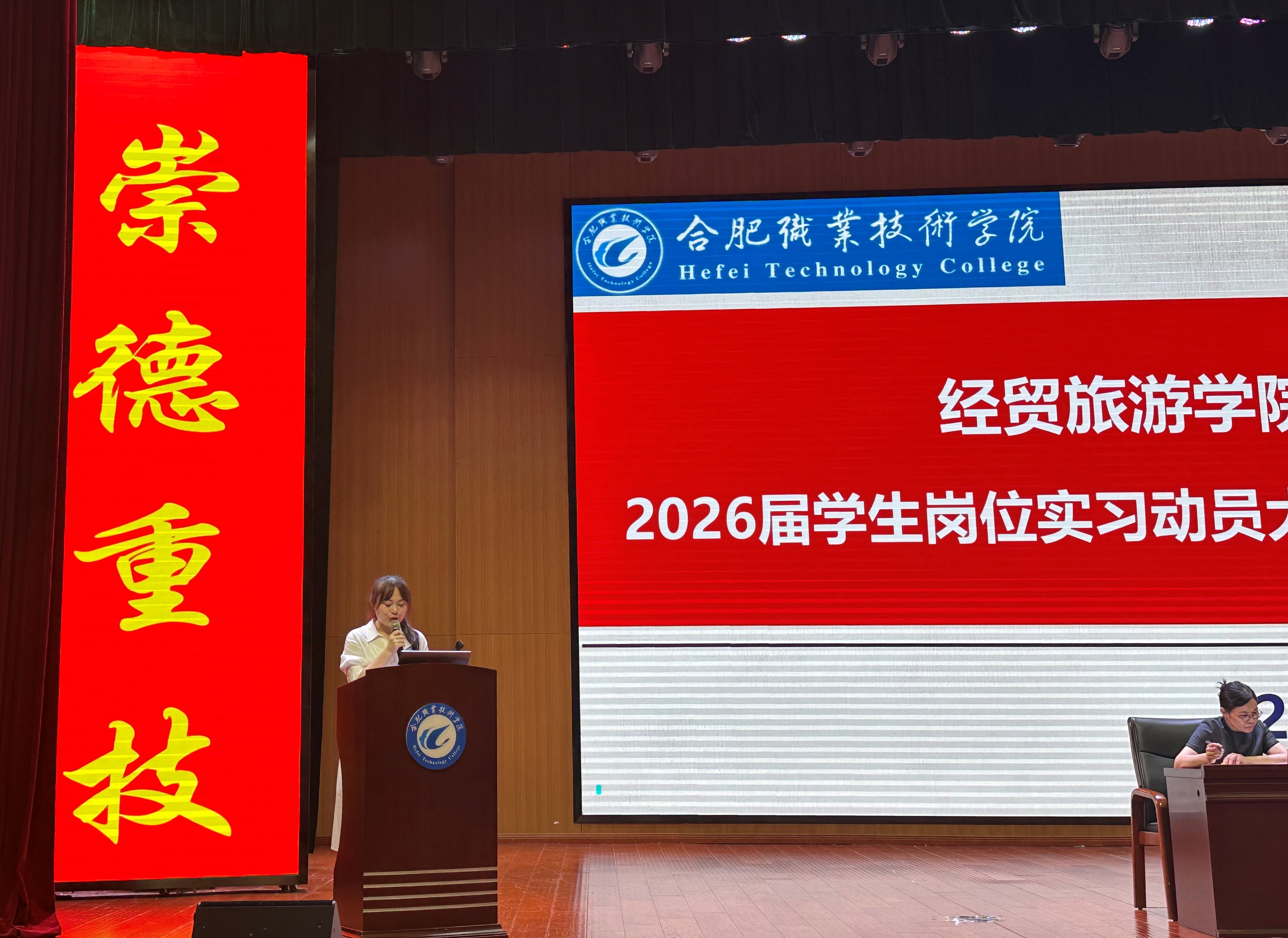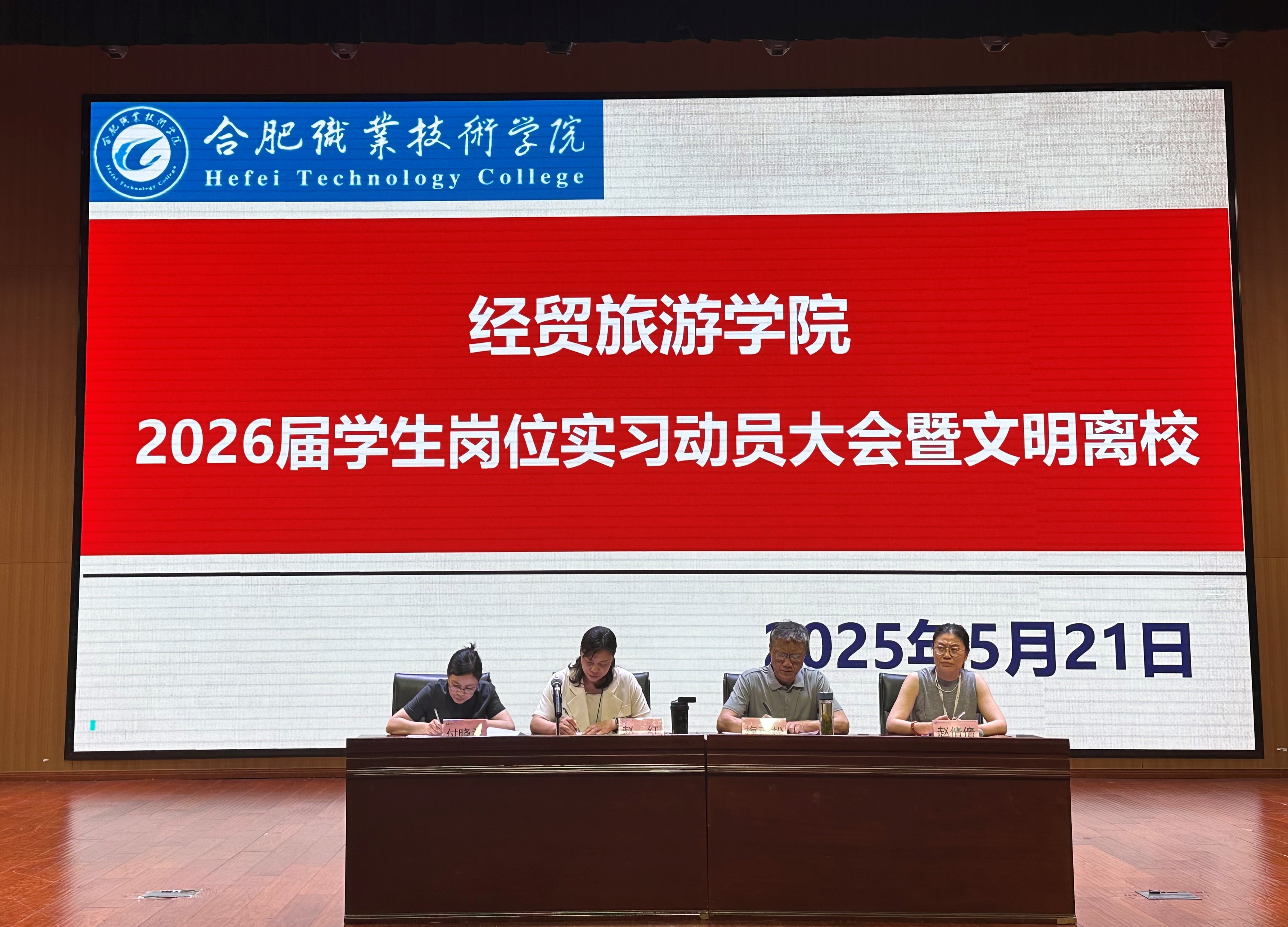 赵红院长首先就学生岗位实习的重要地位与意义做动员前讲话。她指出近两年合肥职业技术学院的社会知名度和美誉度大幅提升,2023年和2024年高考招生计划完成率达100%,投档线连续三年稳步提升,连续五年被评为高校毕业生就业工作优秀单位。她强调我校作为合肥市唯一市属综合性高职院校,在职业本科建设的关键时期,我们全体师生要站在学生成长、院校发展的高度重视岗位实习的重要地位,立足区域发展促进市场化就业,接受挑战实现自我管理,同时应强化实习指导教师职责,做好服务。最后,赵院长用蝴蝶破茧而出的寓言故事勉励全场毕业生,要在岗位实习的挑战中培养工匠精神,实现自我华丽蜕变。